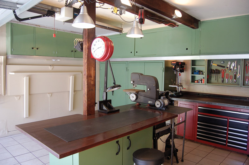 From the moment I first saw Jack’s garage it just resonated with me and the images were instantly burnt into my memory. The nostalgic look and feel, the unusual yet perfect choice of colours, the heavy cabinets, thick bench tops, even the vines growing over the outside wall above the door, it just ‘works’ and creates a wonderful garage atmosphere that can’t be achieved from simply ticking boxes in a catalogue. The other great thing about it is that the build was done on a budget, with many second-hand parts being used, combined with a lot of hard work by the owner.
