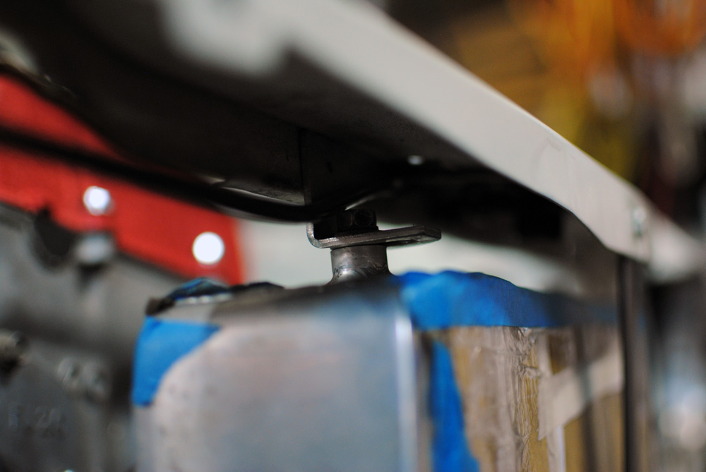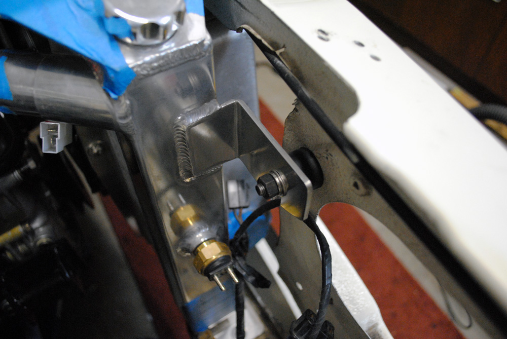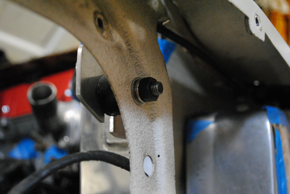 Instead of having a nut and bolt setup, I welded nuts to the back of the radiator support to make it easier for me to bolt the brackets in.