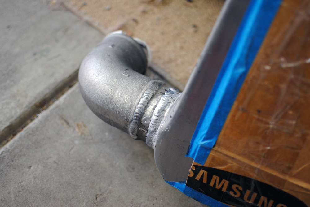 The cooler piping was another part of this round of mods that I did multiple times. The first time I did it I tried to fully weld them myself on the mig welder, but no matter what I did I kept getting pin-hole leaks in the joins. To test for leaks I filled the pipes with water. Also my cold-side pipe needed a tighter bend than I initially thought, so I bought the above “donut”. This series of pictures is my second attempt at piping.