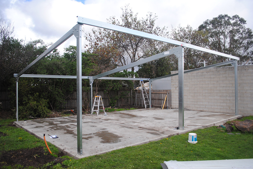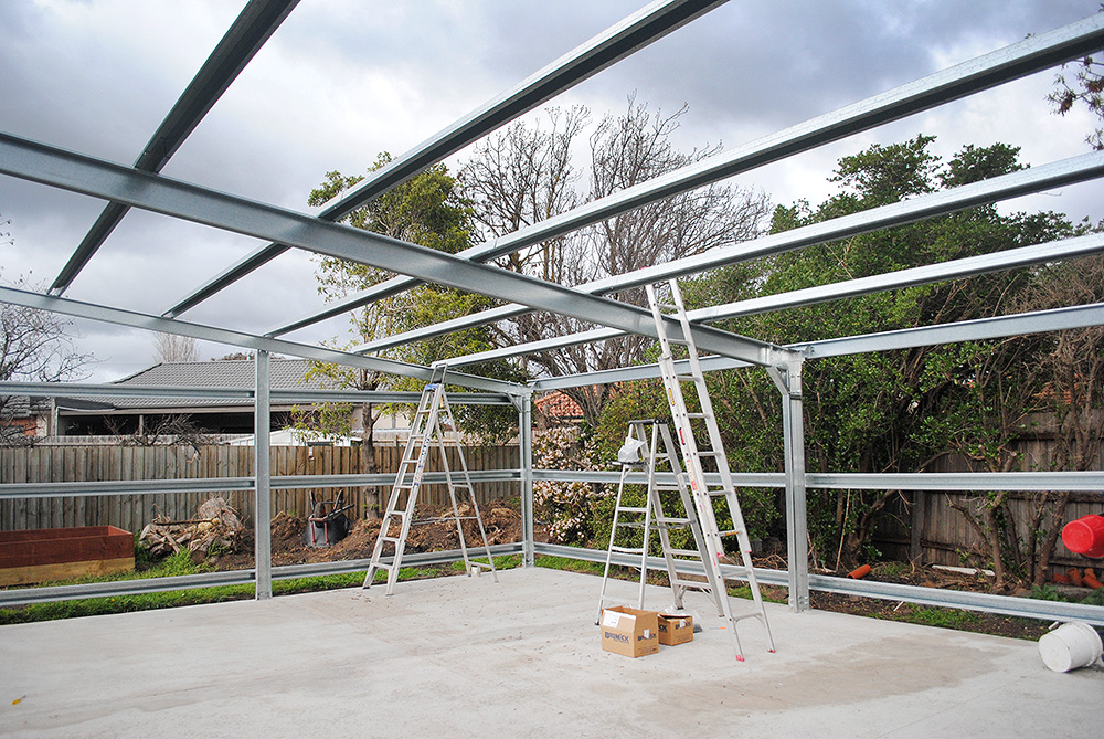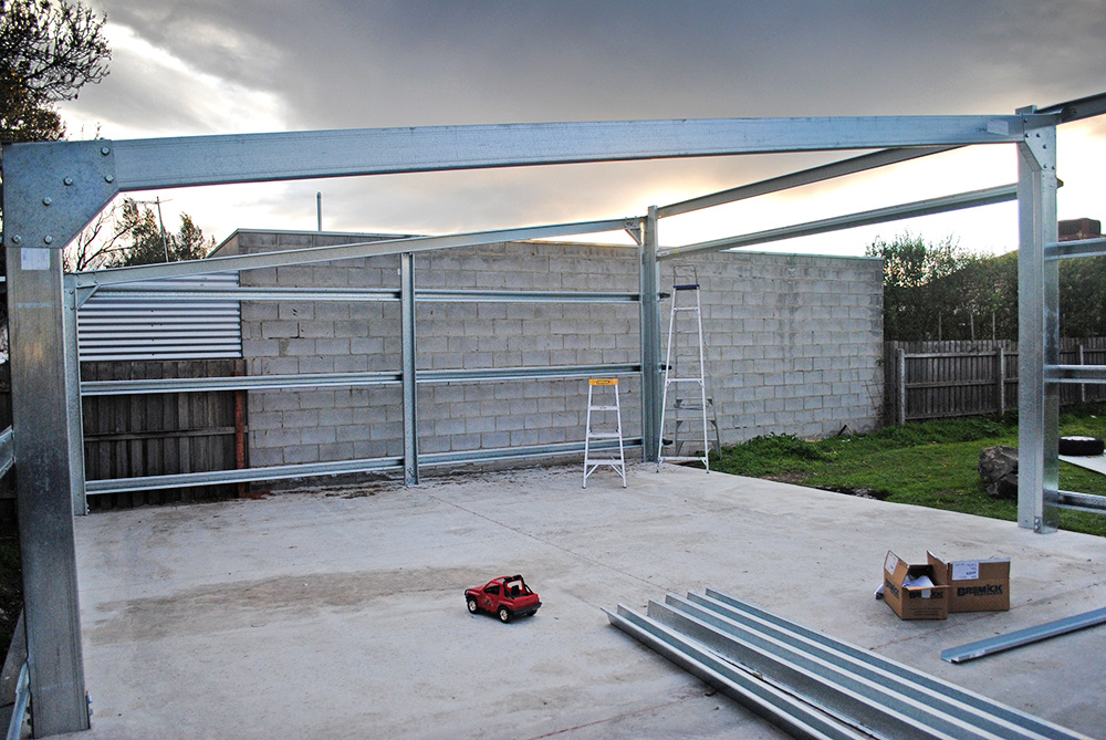 The next session saw all of the horizontal batons and the roller door framing completed. You can see the roller door framing on the right half of the above picture. The mullions (vertical posts) for the roller door had to be dyna-bolted into the slab, as did the other 2 vertical columns that aren’t in the first set of images). The horizontal baton above the roller door opening is actually two batons, screwed together, back to back.