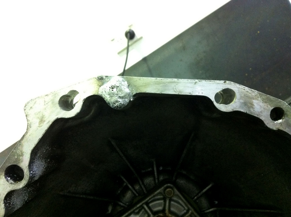 Mid-way during modification. The two bolt holes can be slotted, but seeing as the dowel hole is so important to get aligned correctly it was TIG’d up and re-drilled in the exact required location.