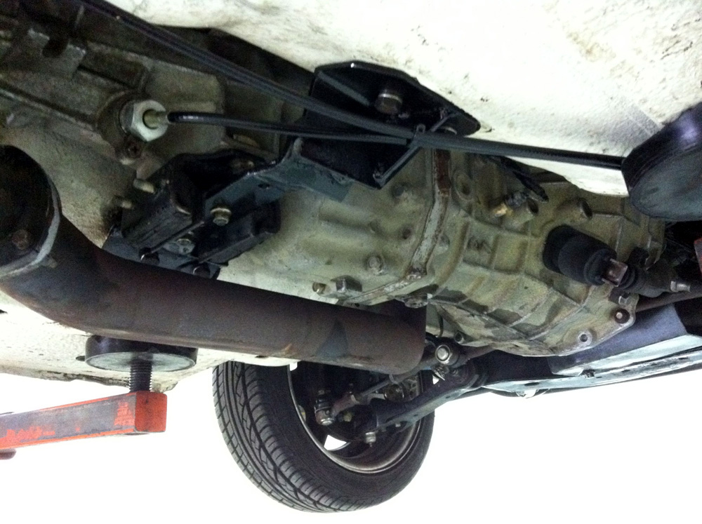 Almost everything bolted back up. The crossmember had to be modified a bit more than I anticipated. I had read numerous times that the gearbox-to-crossmember mounting points were only 25mm away from the original, however it proved to be a bit more than that. The crossmember bolted to the floor using the existing holes.
