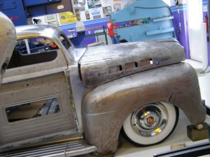 Almost 2 years ago to the day I featured a hand-built aluminium hot rod named Emerald Tide which took it’s styling inspiration from an artist’s painting. Well the same artist has many more paintings and the same builder is creating another awesome car to match one of them. This time it’s a chopped and channeled ’51 Ford pickup going by the name of Lit Up. I know I say this about many builds but the fabrication work in this one really is simply amazing. The word “talent” doesn’t even come close when trying to describe the one-man, metal-morphing, killer-shop-owning, car-building machine they call Jimmy. The custom chassis rails made from laser-cut sheets of flat metal on the first page should give you a fair idea.