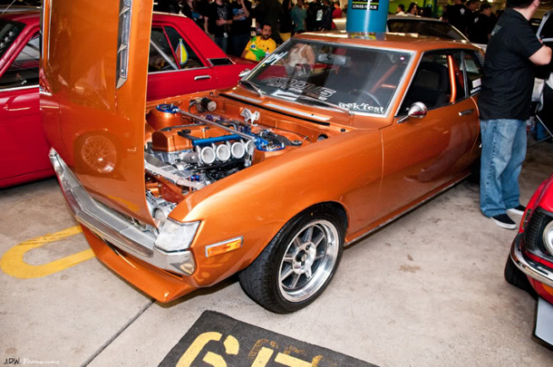As far as cross breeding goes, I’d say this is pretty subtle. An F20C 2.0L from a Honda S2000 gets transplanted into a 1973 TA22 Toyota Celica. That classic Japanese shape reflects the golden years of JDM styling, while the contemporary heart hailing from a different manufacturer – yet the same country of origin – showcases just how far 4cylinder technology has developed. The owner has managed to capture the best of both worlds, old and new, without going so far as to make a Frankenstein out of the car.