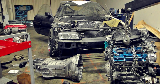 I just did a quick search and noticed I’ve only ever featured 3 Skyline’s since this site’s inception, and the last one was over 2 years ago! I think this one is more than deserving enough to get the marquee back on the front page. It’s an R32 GTR which becomes devoid of it’s RB26DETT straight-6 and AWD drivetrain, instead being fitted with a VQ35HR and 6-speed from a 370Z with a turbo strapped to each bank. I have to admit, the real reason I wanted to feature this car is because I’d find myself continually visiting the thread just to look at the picture of the engine, it’s combination of wrinkle red paint, black plastic, cast and polished metals, silver and gold reflective heat material, AN fittings and exhaust heat wrap is automotive art to my eyes.