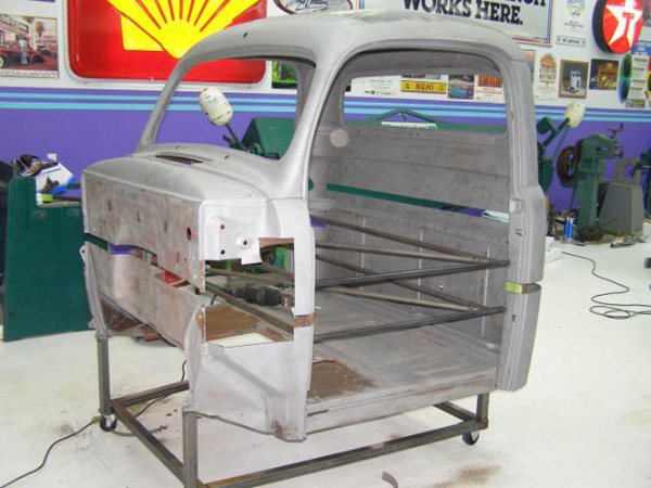 Almost 2 years ago to the day I featured a hand-built aluminium hot rod named Emerald Tide which took it’s styling inspiration from an artist’s painting. Well the same artist has many more paintings and the same builder is creating another awesome car to match one of them. This time it’s a chopped and channeled ’51 Ford pickup going by the name of Lit Up. I know I say this about many builds but the fabrication work in this one really is simply amazing. The word “talent” doesn’t even come close when trying to describe the one-man, metal-morphing, killer-shop-owning, car-building machine they call Jimmy. The custom chassis rails made from laser-cut sheets of flat metal on the first page should give you a fair idea.