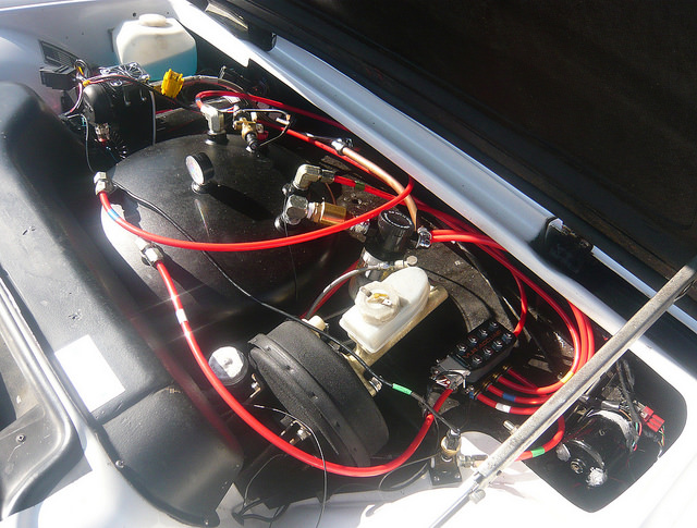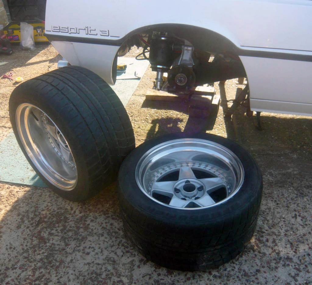 Another Esprit to be layed-out on air, but this one packs a different punch.A Rover V8 fills the space nicely! (After some choice cutting, of course)11.5″ wheels with 315 tyres should be enough to get the power down.I spy…Porsche brakes! Please note soon to be eradicated wheel gap.More custom air suspension, because how else are you going to do it?The red bits make the car go up and down (I suck at captions).Result! This is the ‘driving height’, and can be lowered further.
