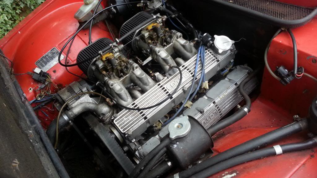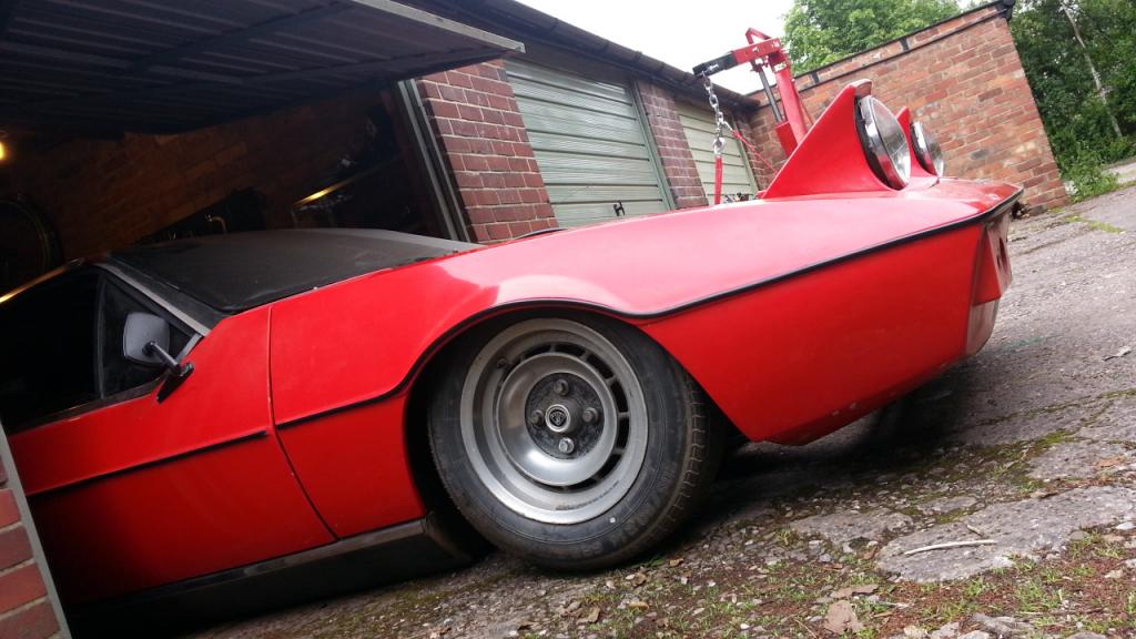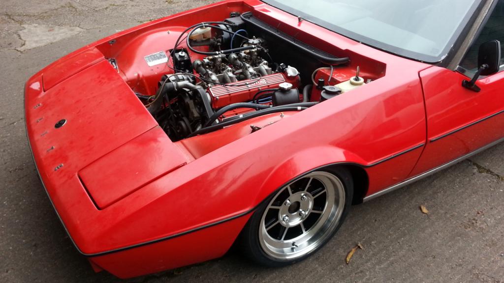 Custom air suspension setup allows the wedge to sit on the floor.With the car looking mighty fine, the owner set his attention on the power-train, starting with this Alfa Romeo V6.The standard 4 cylinder lump was relieved of it’s duties.Custom sump mods to allow the larger engine to fit.Plenty of work was needed to mate the Alfa V6 to the existing gearboxIn between engine work, Dean found time to try his hand at some upholstery, with great success.A trio of Triumph Daytona motorbike throttle bodies sit atop the Italian V6An engine trial fit was important, not only to ensure that it all fit as planned, but also to check out the new rear view!Engine in place, looking like it was made to be there. A mid-engine V6 sports car really appeals to me (especially with ITBs!)The interior looks like a very inviting place to be.A Speedhunters feature to immortalise the car in beautiful photos really tops off the build journey.Squat!