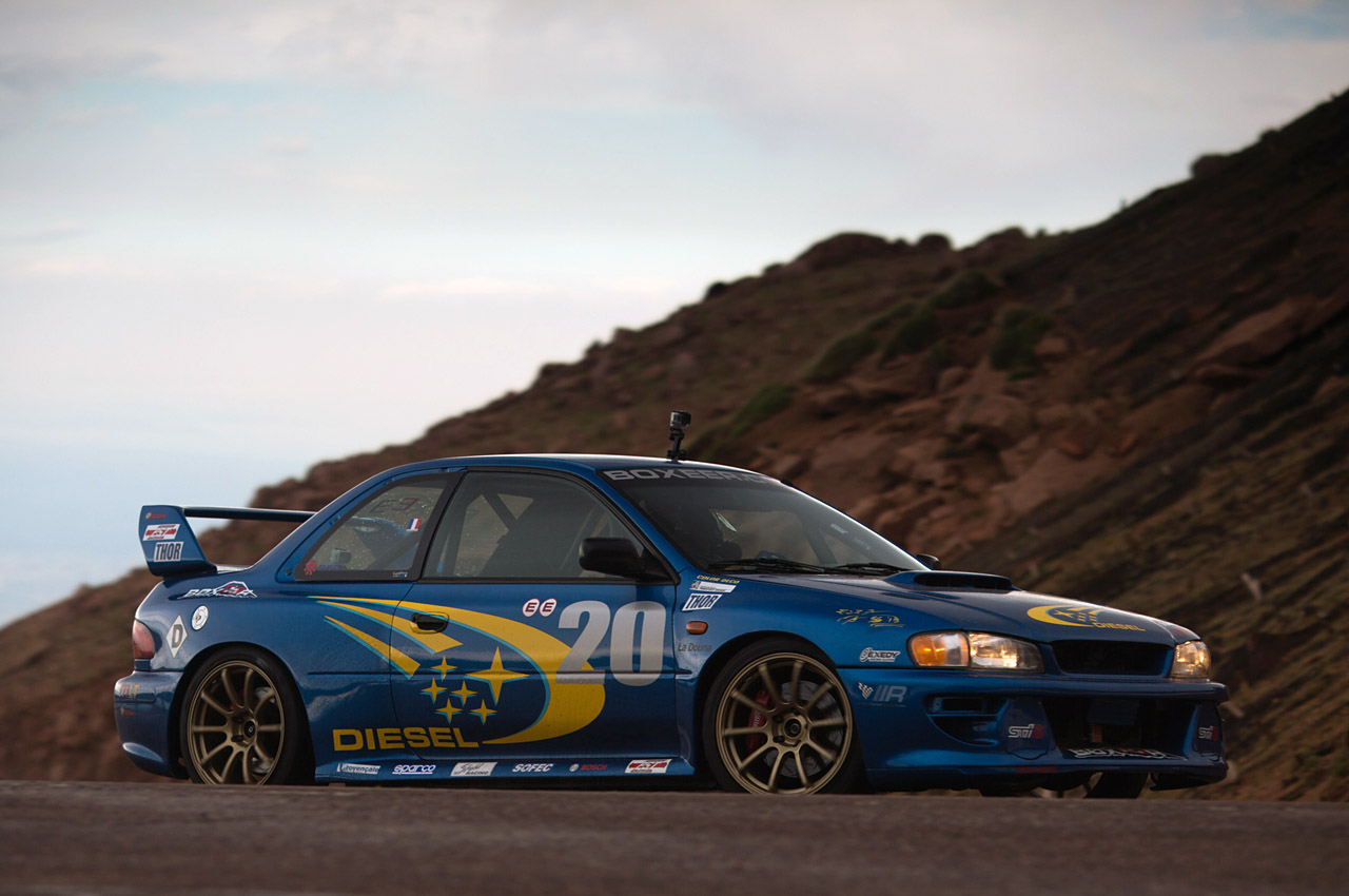 Talk about thinking outside the square. If you bought yourself a dead-stock GC8 Subaru Impreza to attack Pikes Peak, what engine choice would you go for? A single turbo EJ20 as found in the WRX? Or maybe the twin turbo version from a JDM Legacy? Perhaps you’d be more inclined to go for the bigger capacity 2.5 EJ25 from the later model Impreza? Or, if you wanted to be really different, you could step up to the EZ30 or EZ36 flat 6 engines?