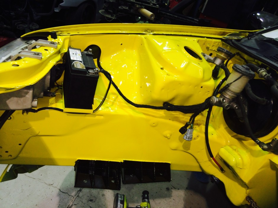 One engine bay ready to accept the SR20 it was built for. The bay looks great, this is whatr you get when you spend the time and get every last corner of the bay ready before painting. We decided to paint the engine mounts black again as it would match the motor much better. Now for the exciting part. We get to start bolting things on for the final time.