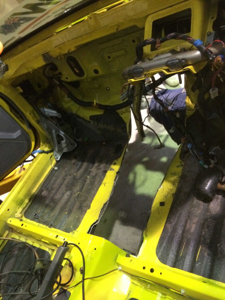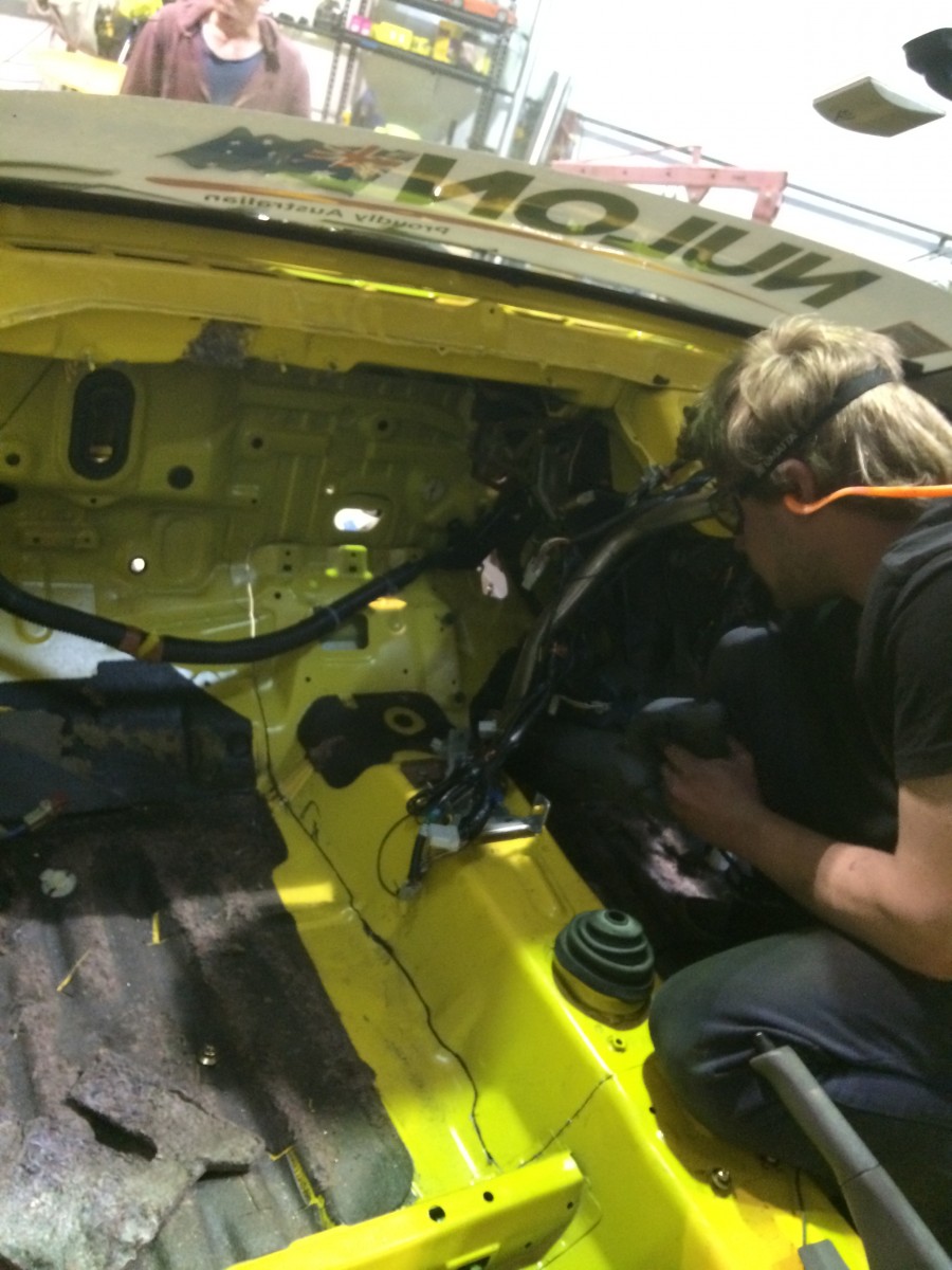 Now we are all ready to Go, Daniel (Grub to his mates) got to work with his magic pen and removed enough room for the gearbox without taking to much strength out of the floor of the car (key to having a tight car)