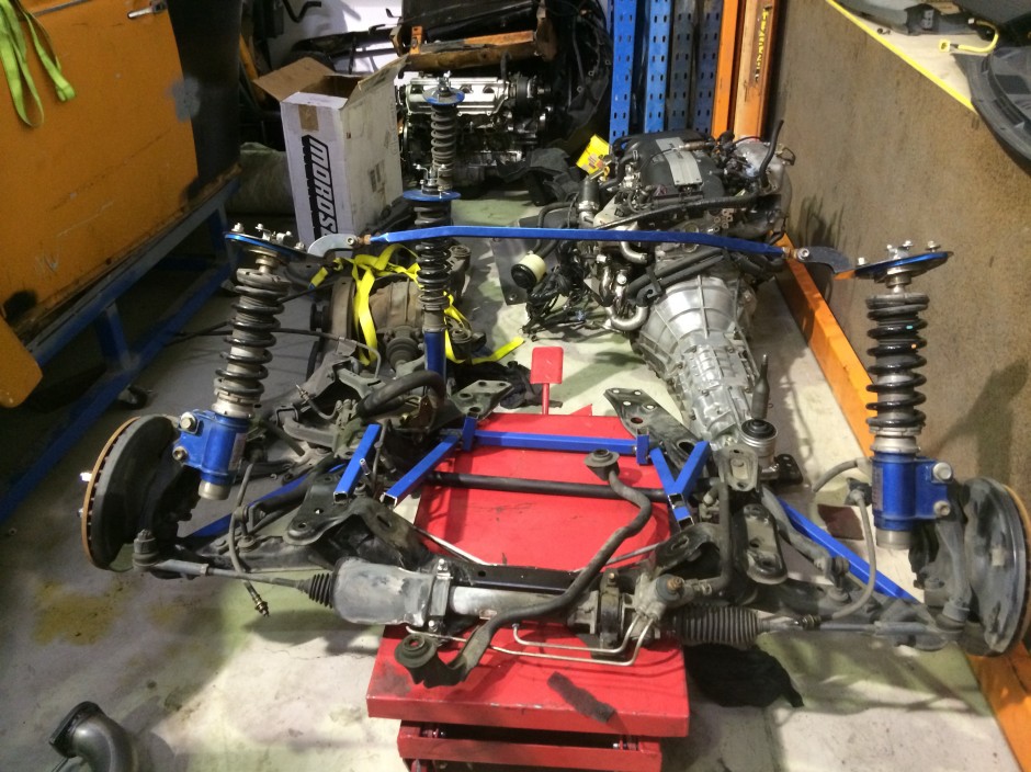 Here we have the main parts for the build, Front end (held together for now with bracing), Â Engine and gearbox which is about to get the life cleaned out of it, Rear end still sitting in Cradle.