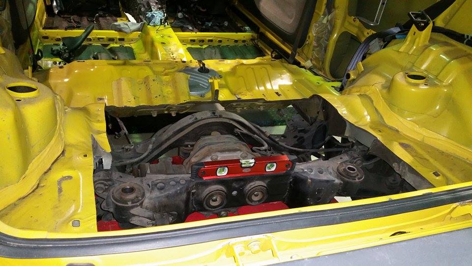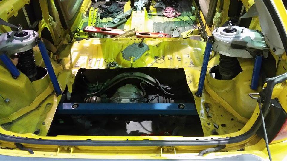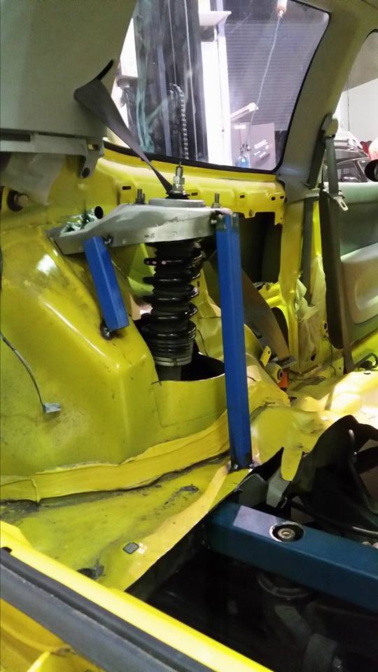 The moment of truth, time to set the Civic down on its new rear end. Once we are happy with it we will remove the blue bars on the towers and reinforce them so they will be stronger than a factory tower, (we have a few tricks up our sleeve for that).