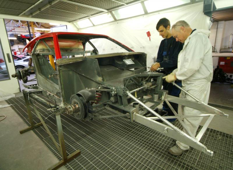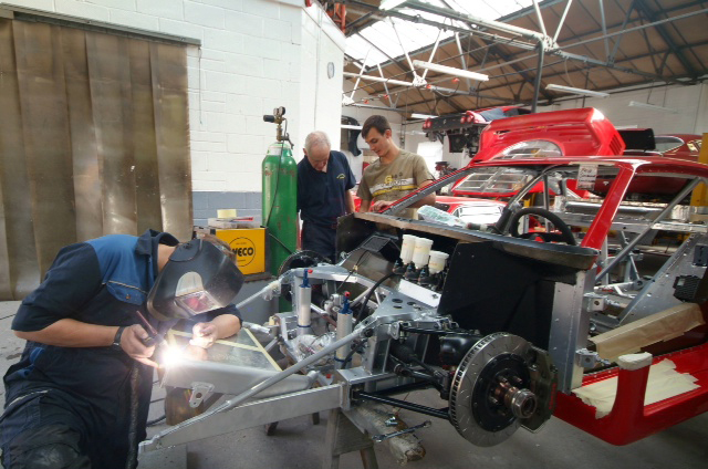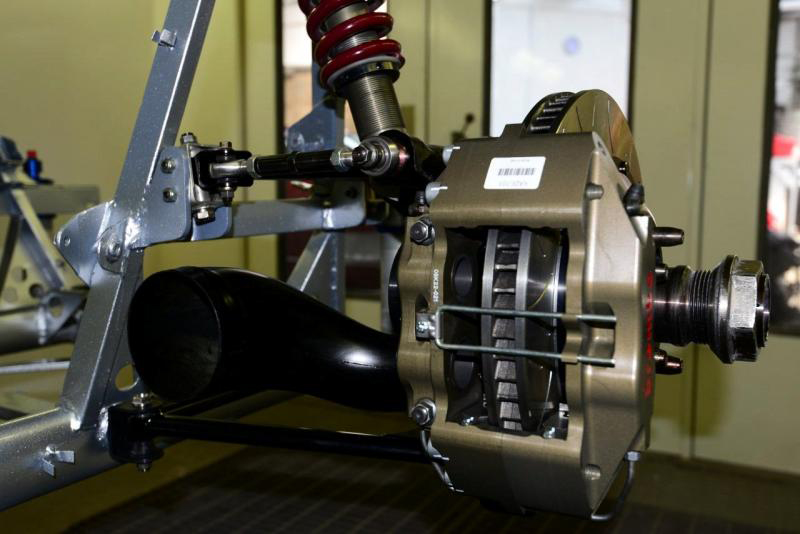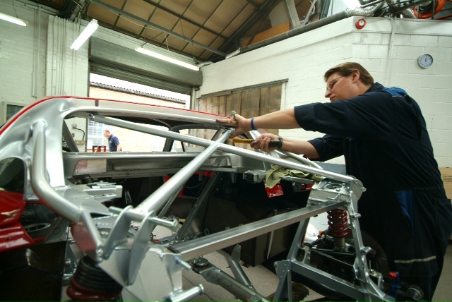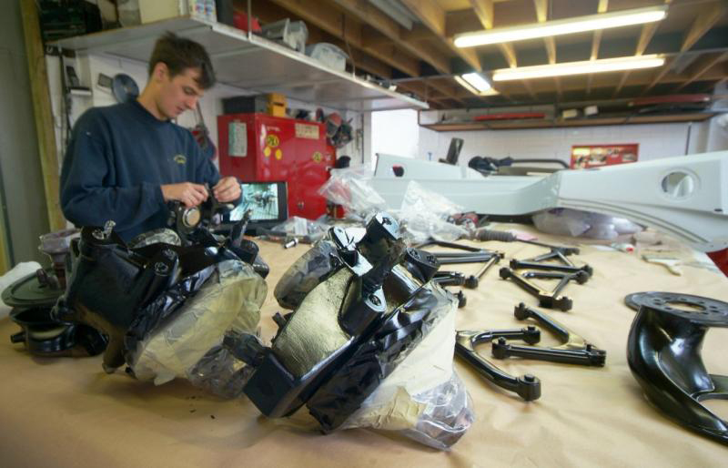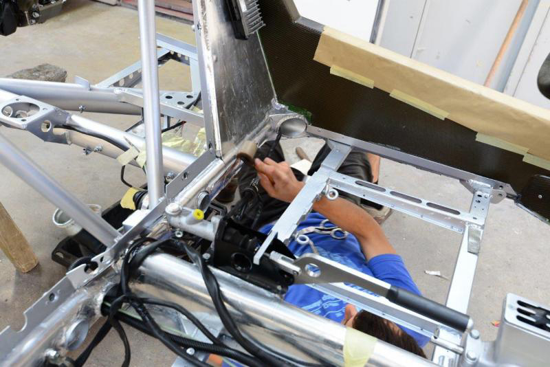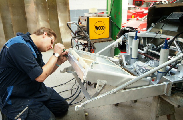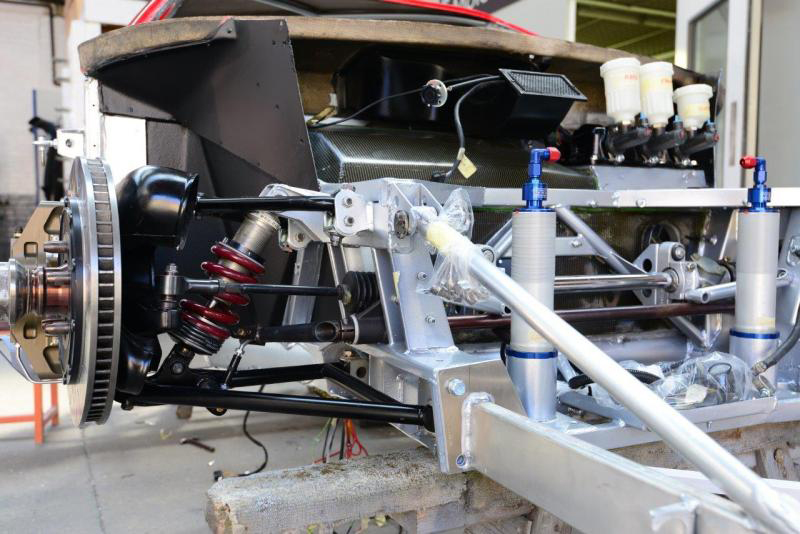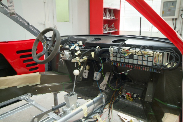 Handbrake in so as to pass MOT (UK rules to enable the car to be road registered). Magnesium pedal box in temporarily but will come out for protective paint as we don’t want this grossly expensive item going the way of The Sultan of Brunei’s.This is a week of major visible progress as all being well we should have the suspension on for good and then next week will be slower as we start to work on the wiring and plumbing which, I am afraid is less exciting to see and report. Meanwhile it looks like we are going to need a new cabin floor-never ending.