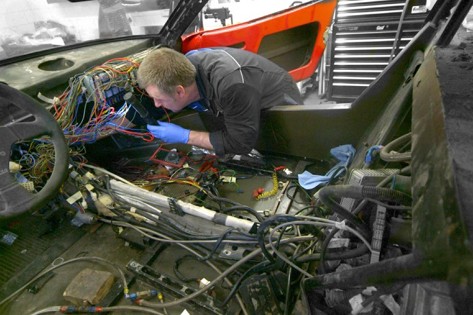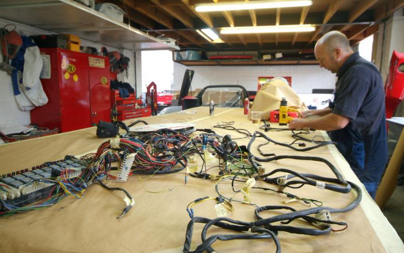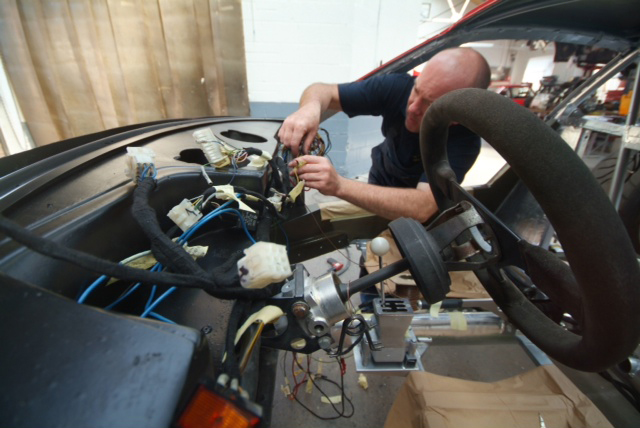 Work on the wiring now well underway. Love being reminded of how far we have come by these shots of the cabin a few months ago and just what a mess she was. Hopefully you can see what is pre and what is post!On the brown paper you can see what we stripped out of the car, a mass of loose connectors and most importantly a totally frayed through main battery line; untouched, a major fire was in this cars future. Some of the wires also had evidence of heat damage so as posted earlier, all dodgy connectors and frayed wiring out, new in, all rewrapped and now being installed. Hopefully it is clear what is pre and what is post!Towards the bottom you can see the old battery cable, amazingly totally worn through and copper wire exposed, against our new version, properly insulated, sitting on the front clam whose speckled appearance is a witness coat so the guys can make sure they have dealt with every nook. Much more work on this entire front clam, plumbing, ductwork integration needed, a complex area on an LM