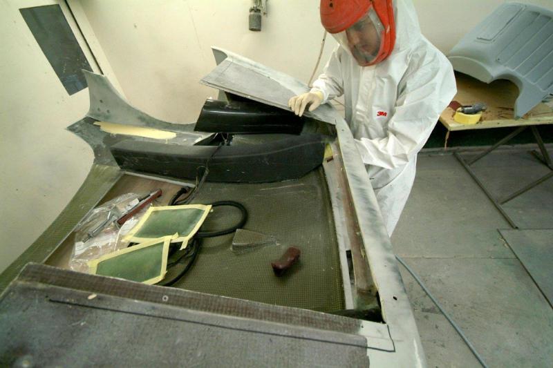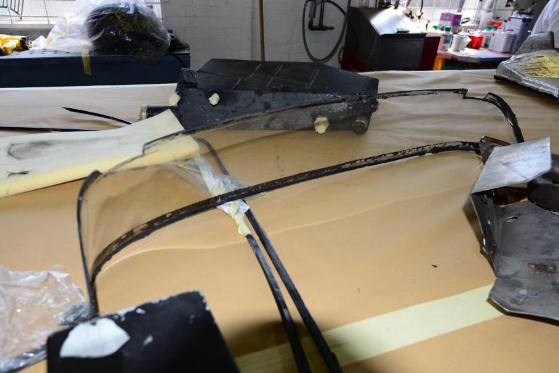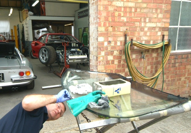 A small insight as to what goes into even the apparently simplest repair, the rear Lexan screen, which as you can see was trashed. Clearly you cannot just pop out and buy one but in my nativity I thought you simply bought some Lexan sheet, bent it to your will and whacked it in. Wrong.Firstly, the screen is bonded into place (no old fashioned rubber seal to take up the slack) so it has to be a very accurate fit to the car. To form the correct bend in the right places which conforms to the window aperture we first made an over size former in alloy and braced it against heat distortion and it is then sent off to a specialist company who place the sheet of Lexan over our Alloy former and then it goes into an oven which has an even temperature (no hot or cold areas). The heated Lexan material then wilts over the former and it clamped around the edges until cool, we then trim it to fit and bond it into place. And that is just this tiny item which I gave little consideration to and now every time I look at the rear view mirror, I will be reminded.It will look nice though.