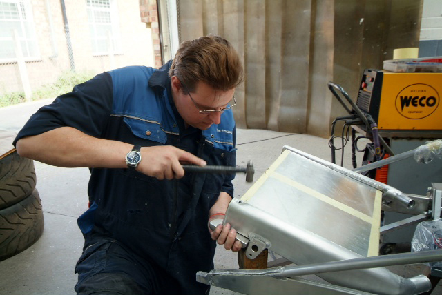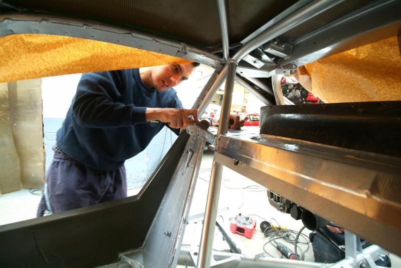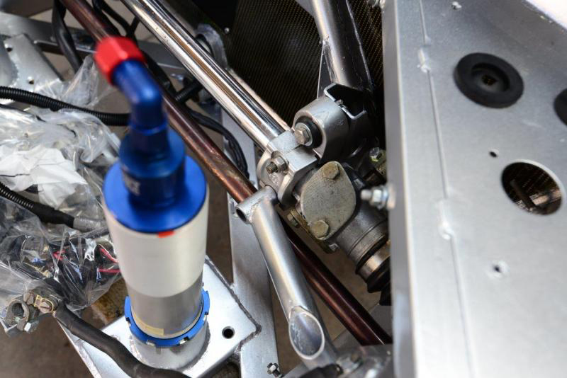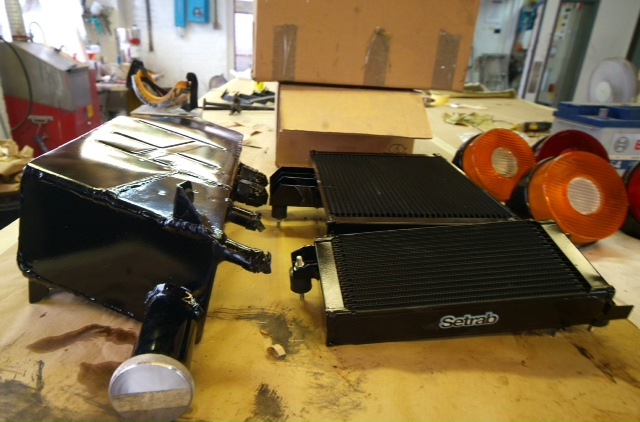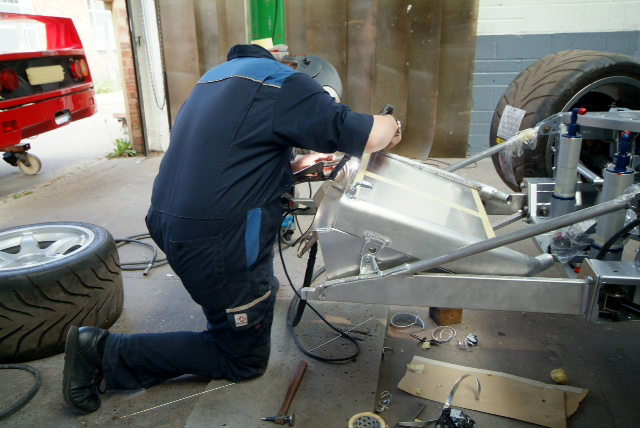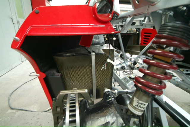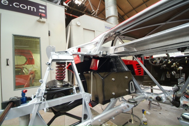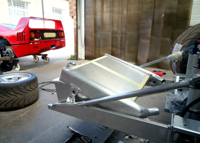 Work has also been progressing on the new radiator as, like everything else on the car, the old one had had it. New high performance core fitted but invisible due to temporary alloy protection panels. I think we may have to also fit electric fans again so as to make the car acceptable for very limited road use and also all that hanging around the pit lane etc.Collector box to channel the air also fabricated and fitted, and aside from the major exception of the motor, this must be one of the last large parts to be readied. Next week will be a truly transformational one with body panels actually being fitted as it starts to come together and by the end of it we will definitely have something that looks like a car.