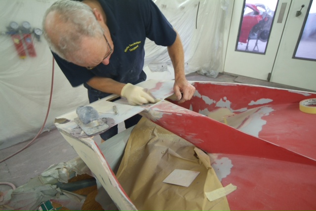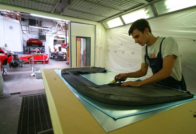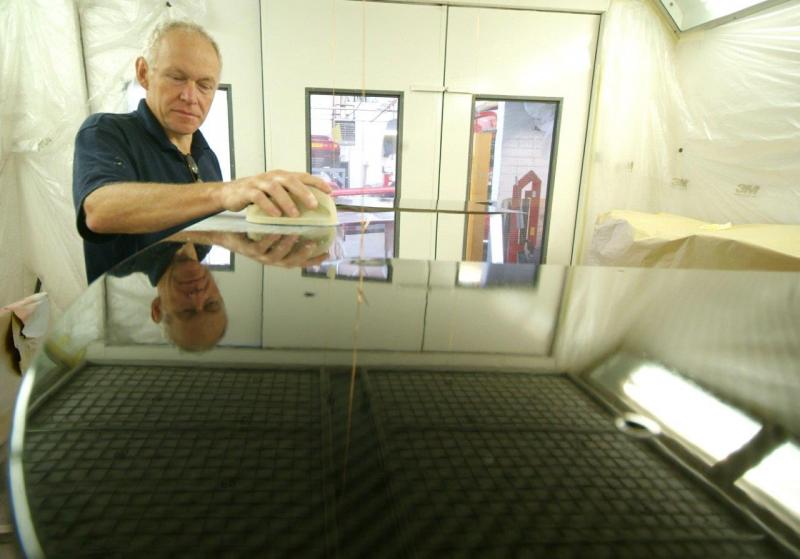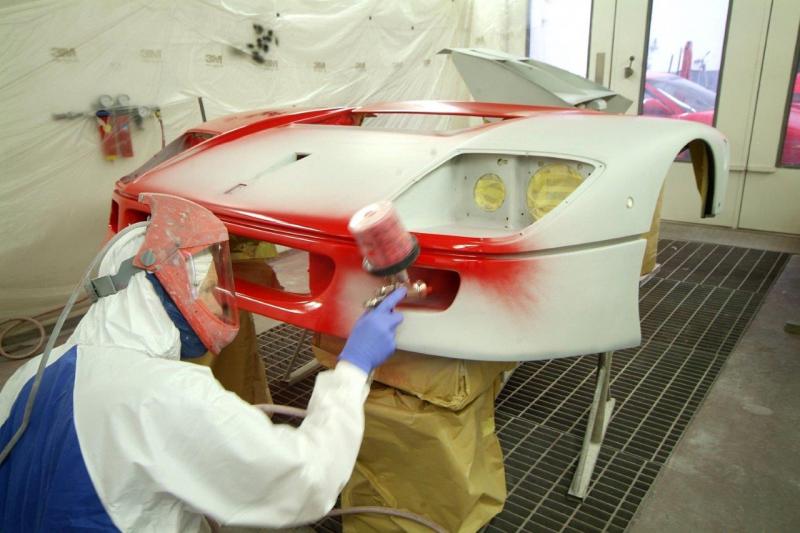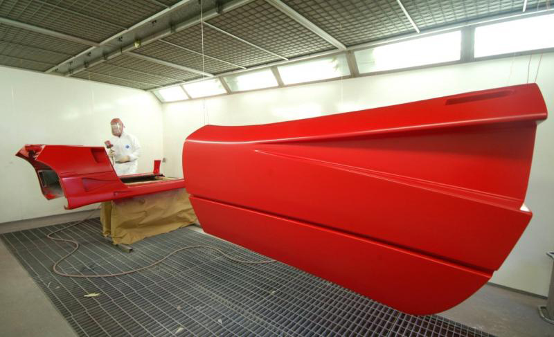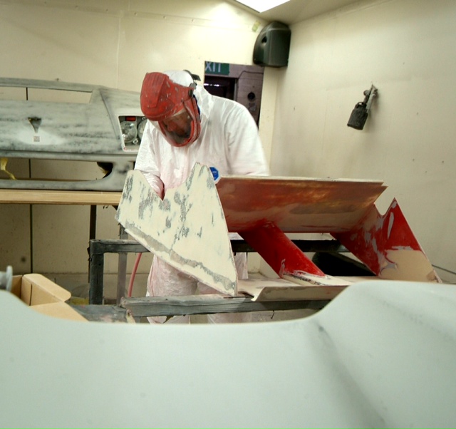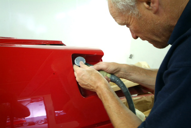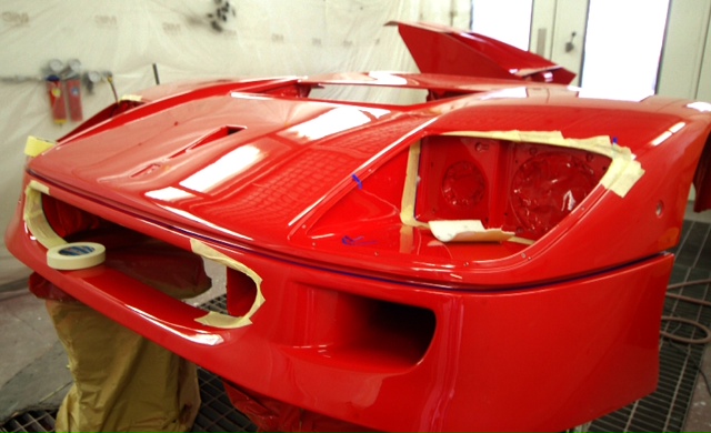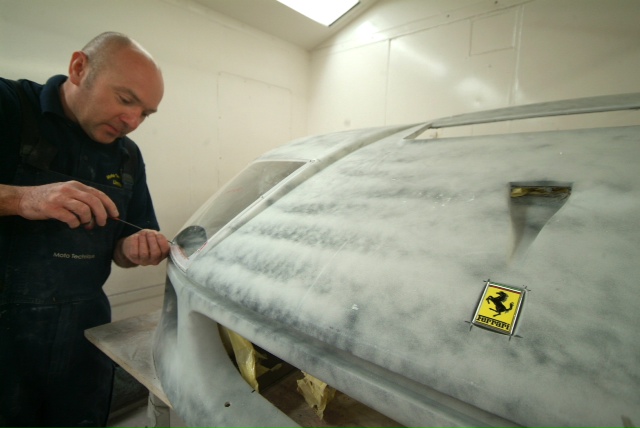 And so it continues. Back in the body shop we have now applied the clear coat and the sanding starts working our way down through varying degrees of coarseness to something you could almost polish you face with, yet is still mildly abrasive.You can see the start of the finish in the reflection in the last image where they are working in the vents, areas that never interested the factory. Some might say non original, I say I want it as good as it can be and how the factory would like to be turning out all their cars if they were not so focused on the bottom line-I can assure you if I was to respray my Spider, I would not want to duplicate the factory finish! Traditional Ferrari orange peel has no place here.