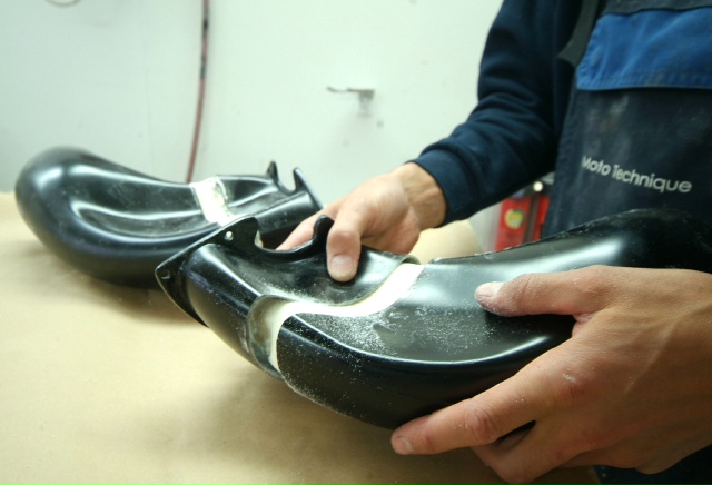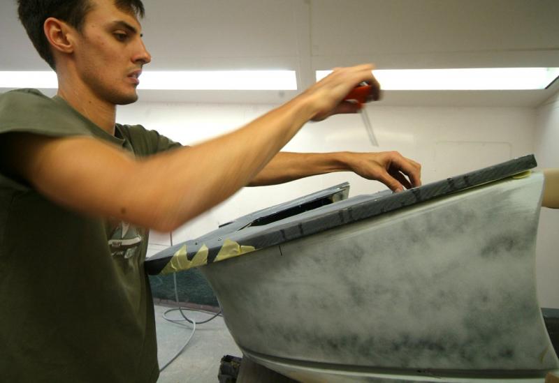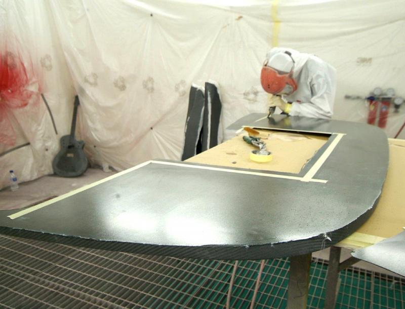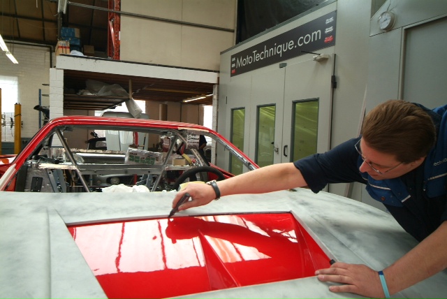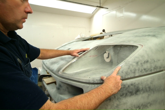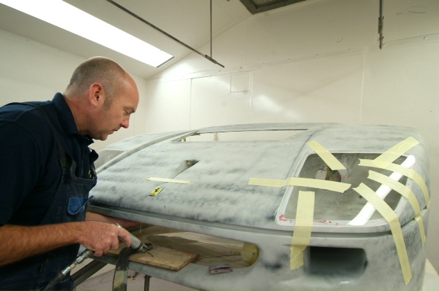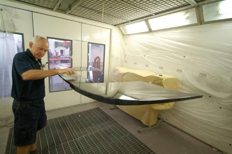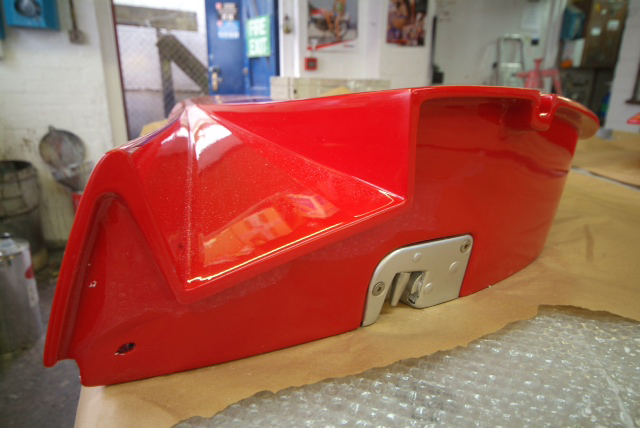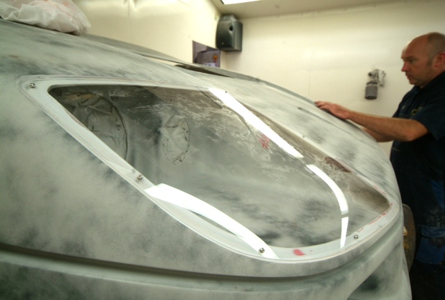 Another ‘Red Letter Day’. Finally the rear upper and lower clams are in colour. This time Neil applying the 2 pack clear lacquer and then wet sanding with 1200 wet and dry shortly to be re-sanded with 1500, 2000 and 4000 grit abrasives and then finally machine polished.Next up, some Michelotto silver on the rear clam around the engine shroud to be detailed in.Still leaves the awkward front clam and air conveyor still to go.