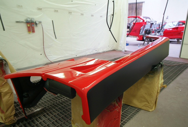 Now into the final stages on the front clam paint. Last shot shows it all polished up and now being masked off for the matt black areas around the radiator inlet, behind the headlights and multiple areas of the air conveyor. Then we can get on with fitting all the ‘bits’Kevin has now got the colour dialed in much better in this flurescent lights