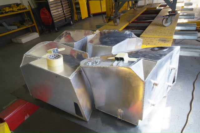 This is now almost overkill. To the industrial art that is the silver framed, Michelotto clad chassis, we now add our fuel tanks, albeit only soft fitted for now. For those who joined the thread late, we built these beauties months ago, works of art in their own right. We did not want to have to take this car apart every five years to replace the old bags and so sought a more long lasting FIA approved alternative using a bit of modern tech. Taking the proven route of alloy tanks as fitted to US cars (these we actually custom built as being racing tanks there are a few differences in the fuel system) we lined them with sealant and filled with foam and then clad first in fibreglass to avoid galvanic corrosion, and then in Kevlar for added strength (and beauty). The various lugs you can see prodding from the tank are for the heat shields which will also be clad in Zircoflex so as to keep as much heat as possible away from them.Mirroring the exact shape of the old tanks, this is somewhat better solution than what we inherited and which you can see here in the first image with its secure professional strapping-not. Very light, very strong and very durable. Maybe we have stumbled on something here as hot off the ‘production line’ the last image shows two new pairs of the raw alloy tanks soon to be the recipients of their fibreglass vest and Kevlar overcoat, one set for the other F40 in the shop and another set for another customer, both of whom are fed up with constant replacement. Orders please!This first shot does a good job of reminding me how far we have travelled. What a mess.Also here you can see us making sure the new tanks will be comfortable in their new beds and ensure no shake rattle or roll, secured with a stainless steel strap a la Dino.