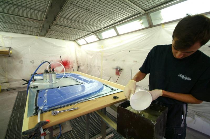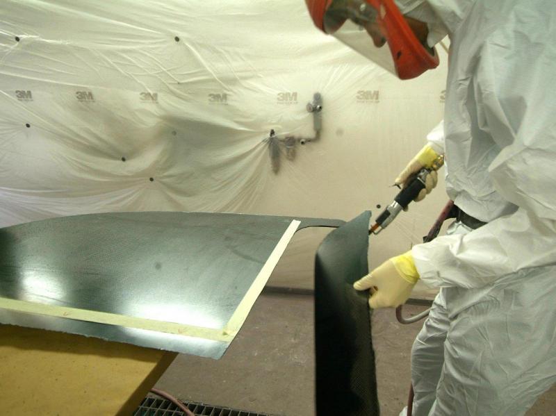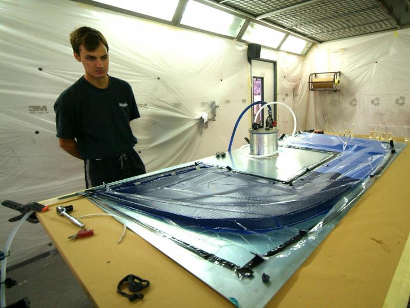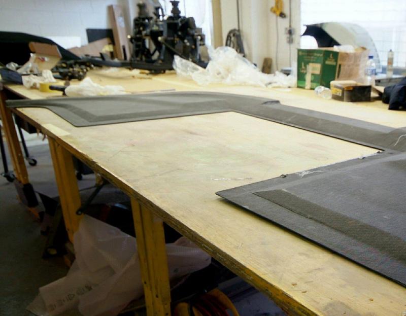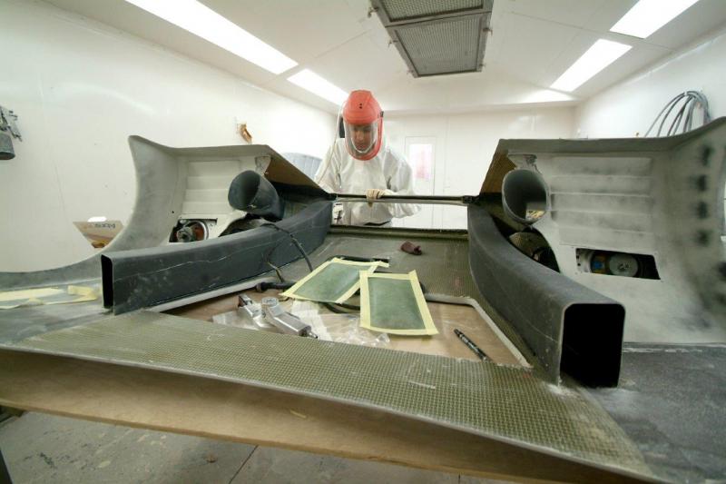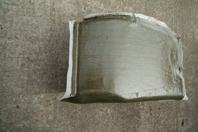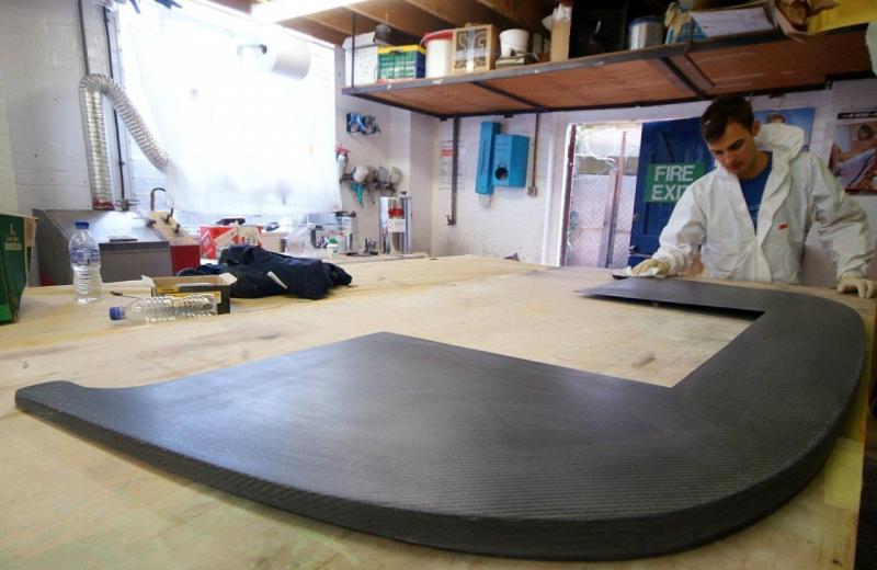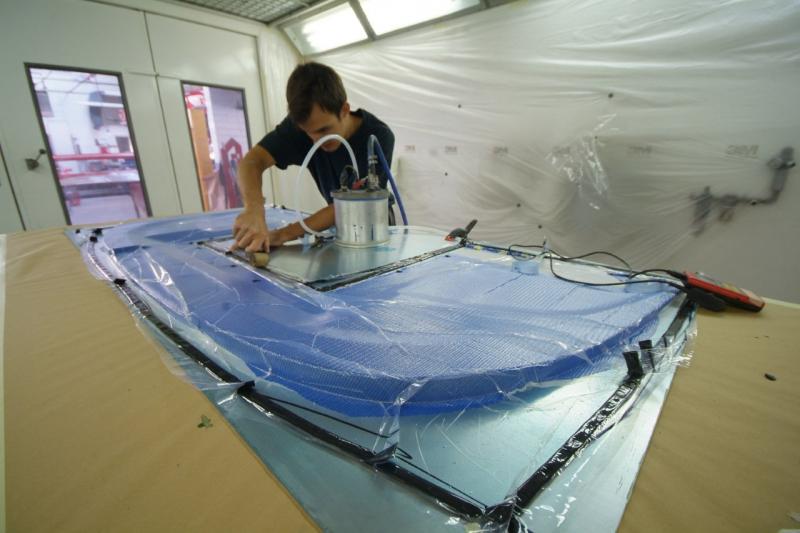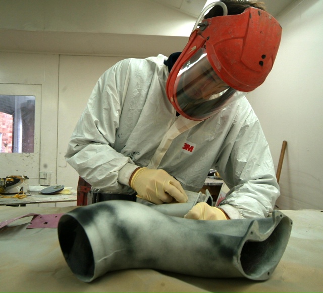 Meanwhile, the next stage. This all looks quite straightforward to the untrained eye, meanwhile much detailed control work is ongoing in the background. What we have not shown is the curing process which is a high risk area as the resin is heated to thin it’s viscosity so as to aid resin transfer, a rise in temp of 10 degrees centigrade halves the resins viscosity which is thick like treacle when cold …………. Obviously this has to be balanced with speedy transfer against the danger of premature curing half way through the process or an exothermic reaction which in extreme conditions can catch fire; you can play with the activator as various speeds are available and you can mix them to slow or speed the curing process so it is best to err on the side of caution and go for a slower cure. The booth is run at 40 C during the transfer process, by the time the part is fully saturated, the temperature of the piece naturally rises due to the curing process and it is baked using a “ ramping process†whereby it is cooked for one hour at 60 degrees C and then allowed to cool, then the process is repeated taking the temperature up to 70 C and then finally again allowed to cool and do it again at 90 C. The ‘boil in the bag’ splitter was then left to rest for three days before de-moulding and the part is now stable; it is tempting to de-mould and check earlier when the part is green but this can lead to warp age. The splitter is then undressed, rip film ripped etc as you can see here.You will appreciate why this does not translate into much photographically but it is still a fascinating procedure.Tomorrow, finishing.