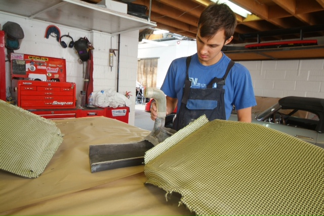 We keep on digging into our box of parts thrown together on disassembly without detailed consideration at the time and now we come to need them, what do we dig up but this sort of rubbish. The rear wheel arches, a mess, untidy duct work all very un Germanic (car was run by a German race team) and just not up to scratch, so yet another element for ‘Mototechnique Magic’.You can see the progress from what we started to where we currently are, still with some work to do on the ductwork, but a veritable world of difference. These show the rear wheel arches laid up in Carbon / Kevlar and that stripey material is a layer of sacrificial rip film …… it soaks up the excess resin and when removed gives that pro matt finish.Let me tell you they don’t give this Kevlar sheet away and I was hoping we had just about seen the back of it and frankly I am not sure where Kevin can fit anymore. Unfortunately I feel hoisted by my own petard and keep on coming back to my motto, ‘the last bit has to be as good as the first’.