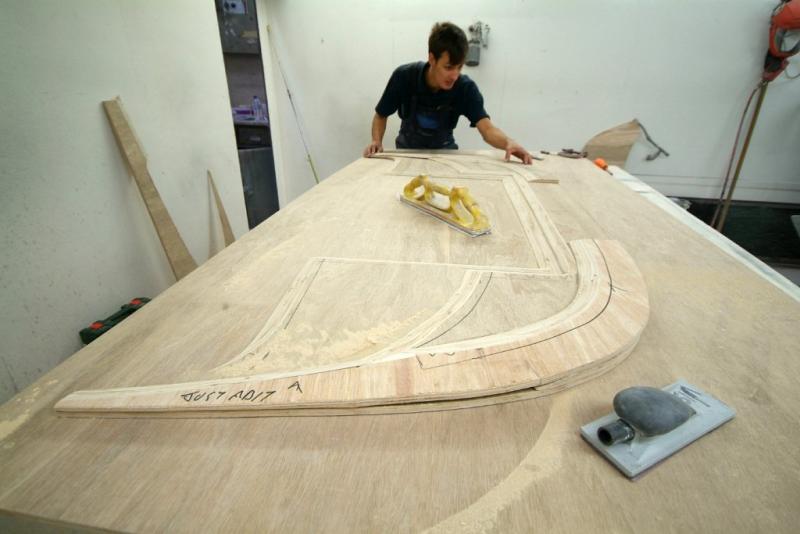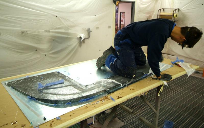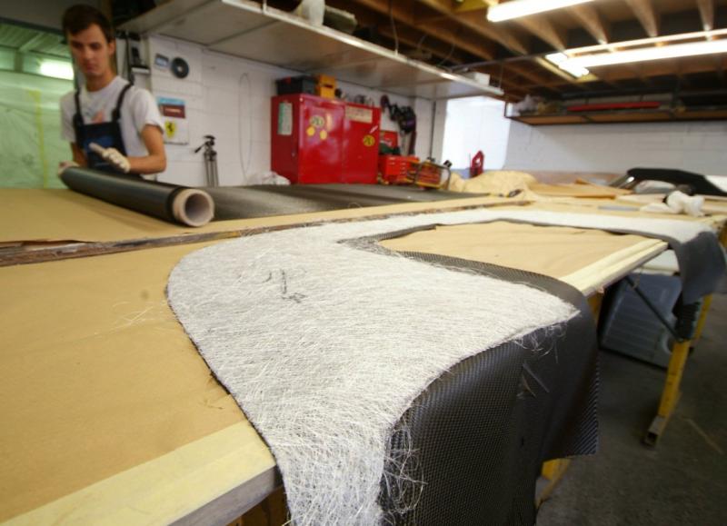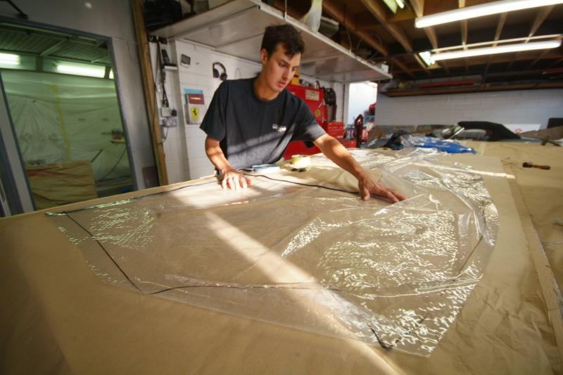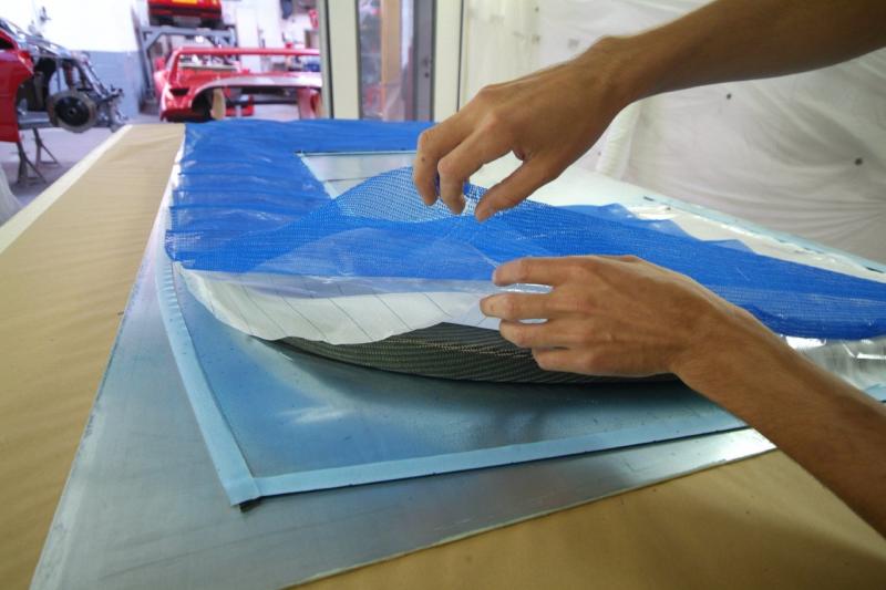We are making a new front splitter as the pure LM one is simply not suitable for any form of road use, whereas the slightly different GTE form is, so we have decided that as even this slightly more modest affair will inevitably get damaged on the streets of the UK, it had better have some small element of replaceability married with an element of practicality. I knew Kevin would find somewhere else to carbon.Here you can see James now demonstrating his skills as a carpenter to add to his list of capabilities, and forming the marine ply filler which as you can see tapers, in depth, towards the rear. These parts have then been glued, screwed and sealed together and once finally shaped up,you can see the result in the 4th photo, a beautiful light ply core.This unit will then be encompassed in Carbon Fibre using the Resin Infusion method whereby the resin is introduced under vacuum as per the attached demo shot of James working on an F40 door in the last shot.