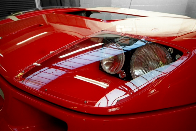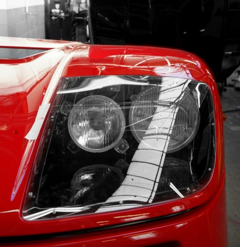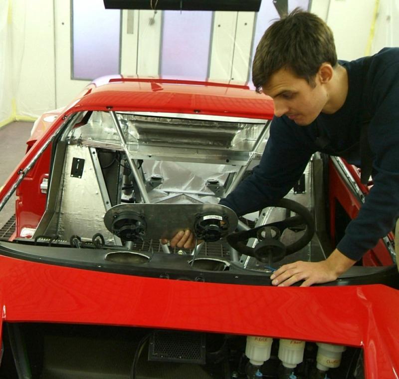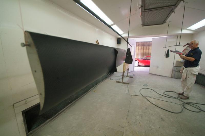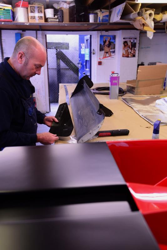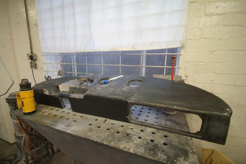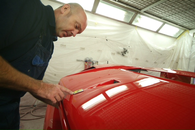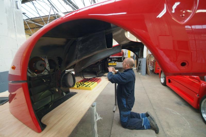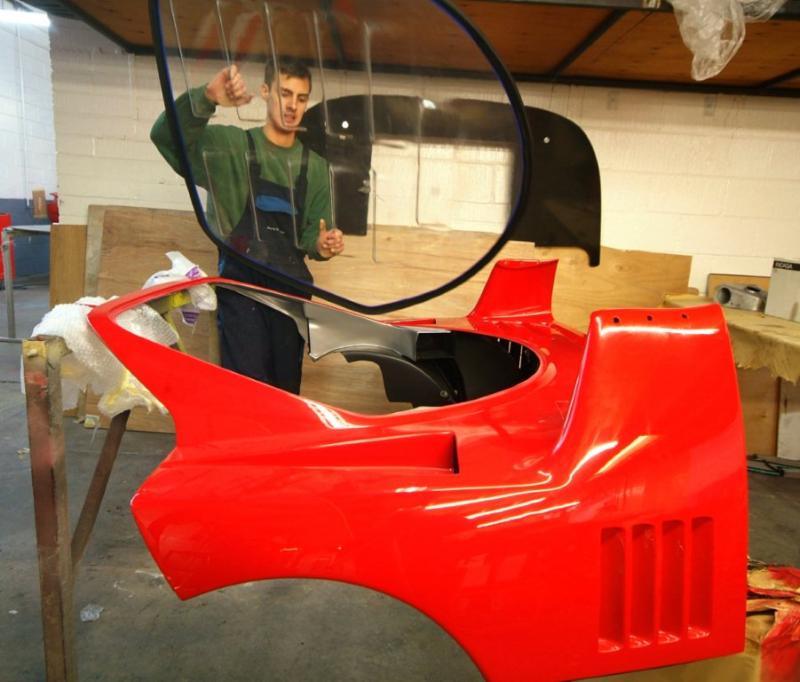 The front clam is now just about there. Black on, lights in, lenses on and even that vital Badge. On the paint Paul is correct. Effectively it is paint drying by a chemical re-action. I asked Kevin for a fuller answer and he tells me that whilst it is true to say that great progress has been made in lowering the amount of solvents released into our atmosphere during the painting process, most of this is achieved by the use of ever more sophisticated catalysts which allow ultra high film thicknesses delivered by fewer coats and cause less overspray loss age; Some say that Water based paints are a bit of a myth to assuage the green lobby, the “water dilutant †has solvents included to speed evaporation and due to corrosion problems comes in plastic bottles which then go into land fill so all we have really done is to have moved the problem on. Water based paints take a lot longer to evaporate than solvent based products and so we now have non productive periods where the painter has to “ watch the paint dry†he can’t drop onto another job because he is suited and booted and has to keep clean, in the meantime the compressor and spray booth are running flat out burning up resources. Nasty chemicals are still used to cure primers and filler coats which account for most of the product applied