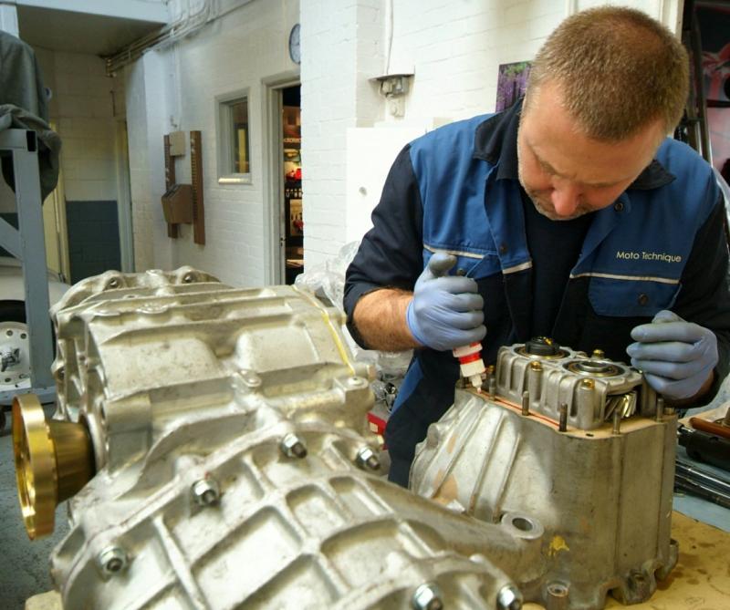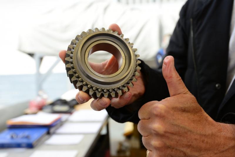 A switch back to grey from red for a bit of variety. Our gearbox has lain almost finished for some months primarily awaiting the new and impossible to source reverse gear. Finally, six months and more in the queue, a new and improved reverse gear from Crosthwaites. The original and unavailable Ferrari part is actually composed of two separate elements whereas our new version has somehow been crafted from one, a really trick piece of engineering. Now we understand how they could build an Auto Union from scratch.First shot shows the old scored gear, the others the new.That means we can now finish up our gearbox and here Colin is fitting the drop gears with new bearings on the Bell housing and when finished all castings will be cleaned up and sprayed. The entire gearbox has new bearings.