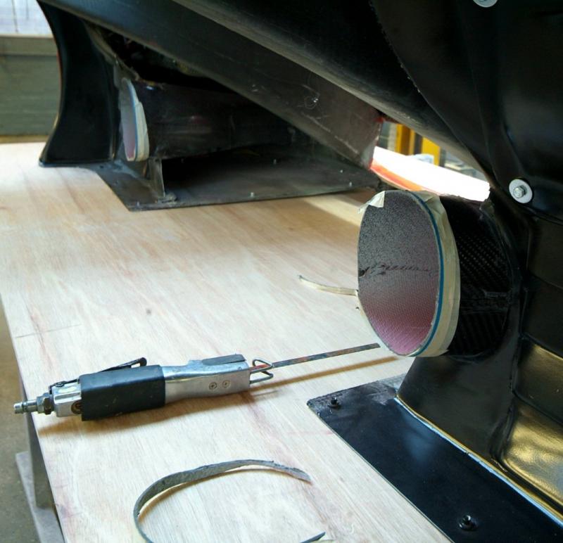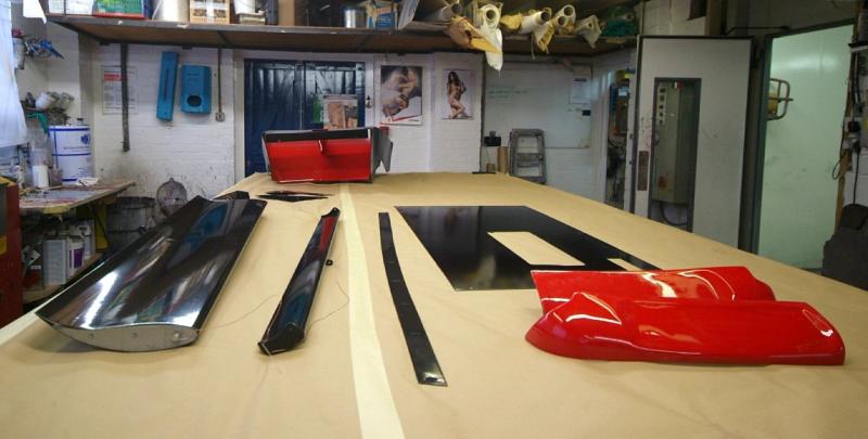 Rear wing now stripped down, degreased and coated which revealed some pinholes so a little further work required there. Large carbon pat to the right is part of the undertray. Be really good to get that all finished up and mounted so we have a complete rear clam, next week all being well.
