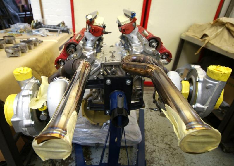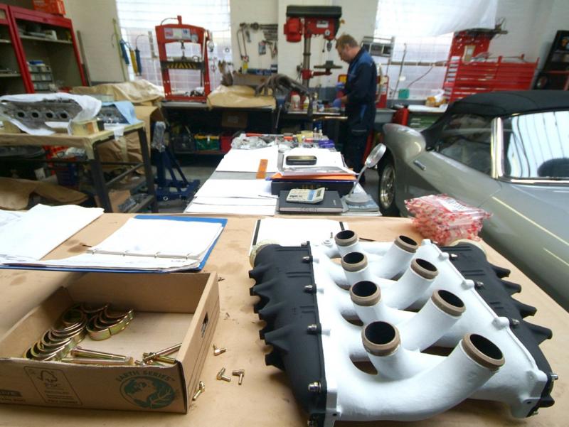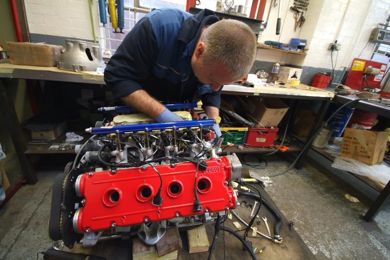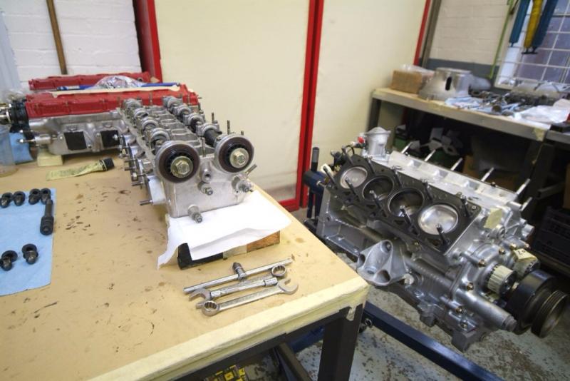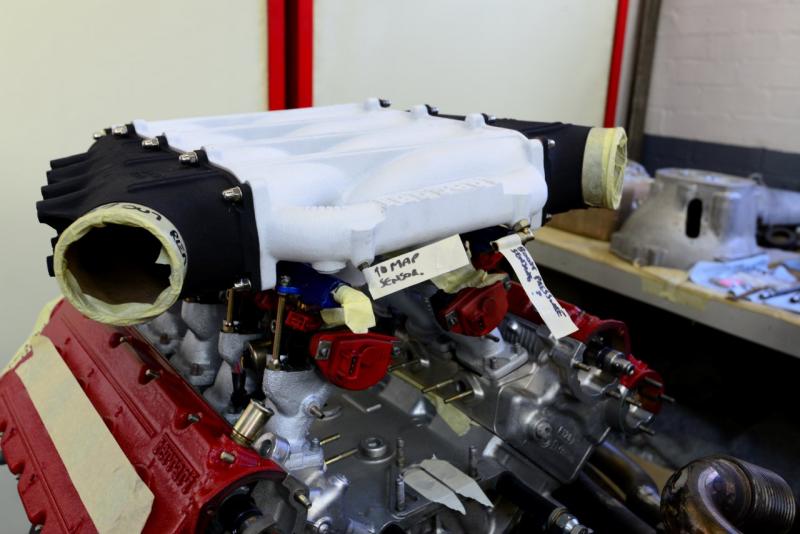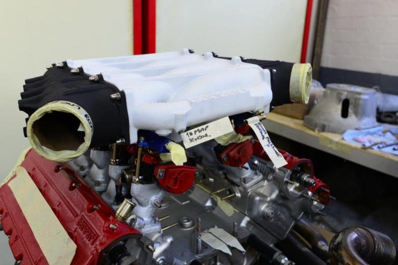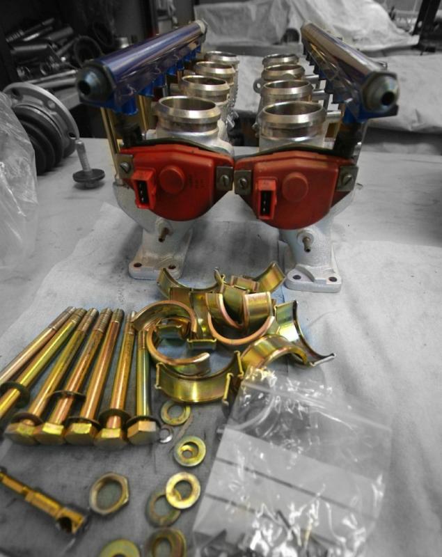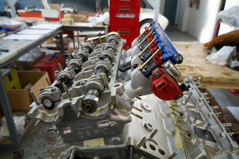 A bit of engine news.New stainless cylinder head bolts now in and Colin is dry assembling everything in normal Mototechnique manner, so as to check positioning of Turbos and to make sure everything will go together without any problems when he starts in earnest later this week. We also need to measure cable runs for sensors etc so we can finish the loom, so having the engine in sort of one piece is the only way to do it properly. Note rebuilt throttle bodies and injector rails with all newly anodised parts-I hope this too will be a work of art when Colin has finished with it.