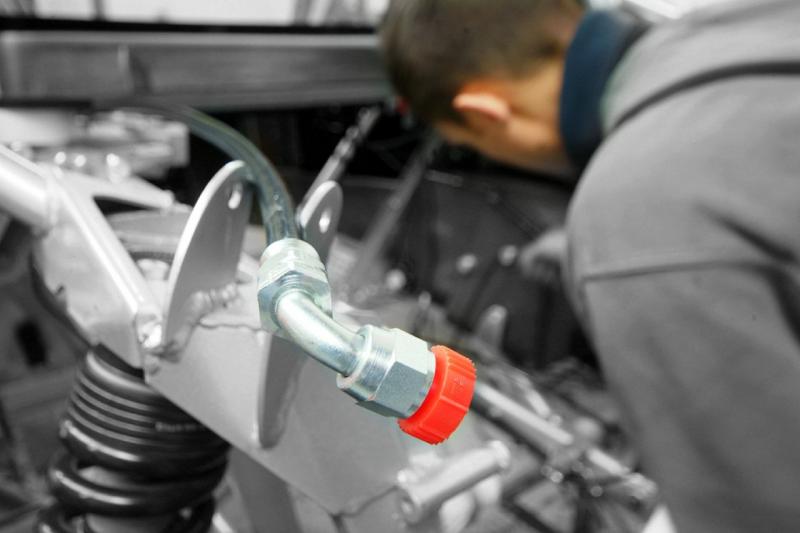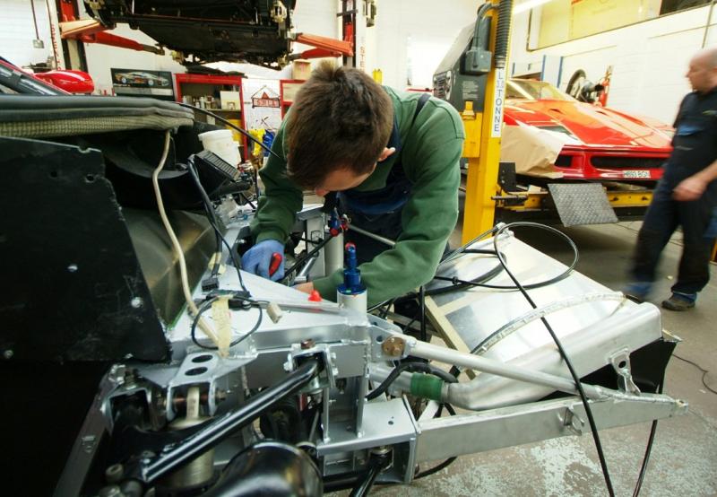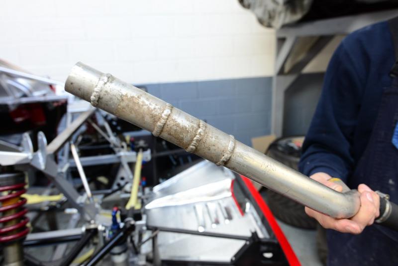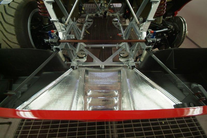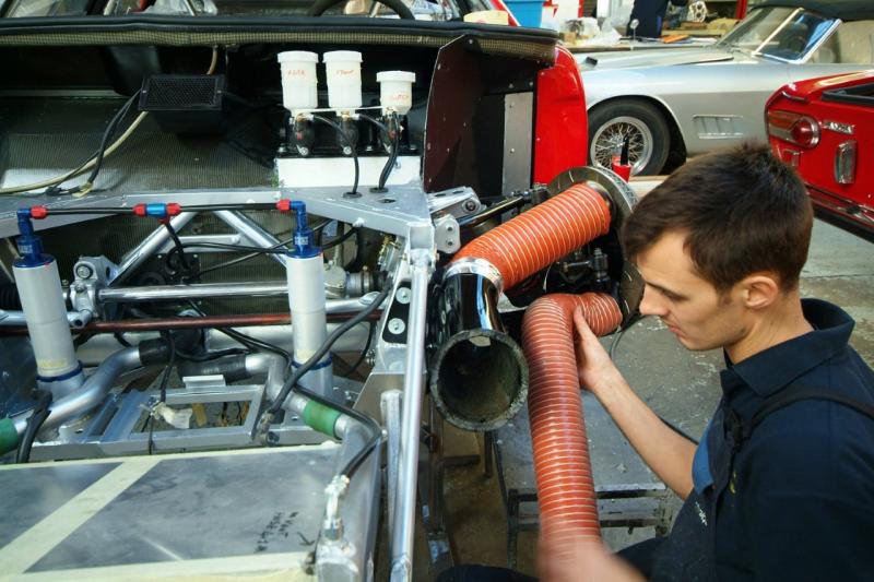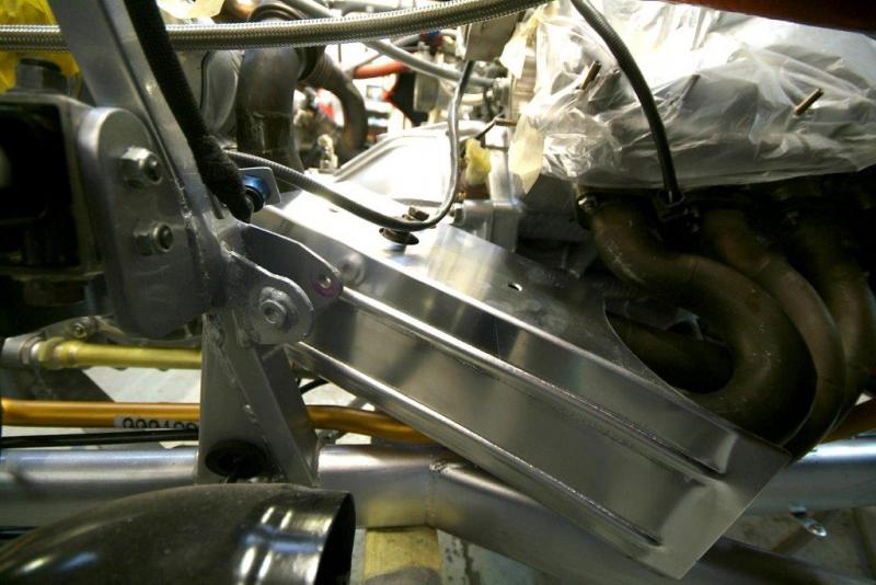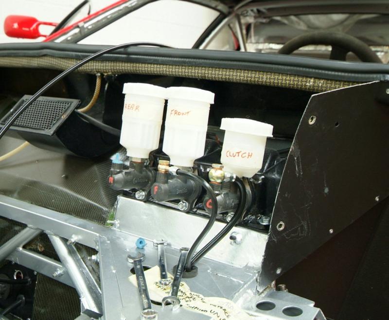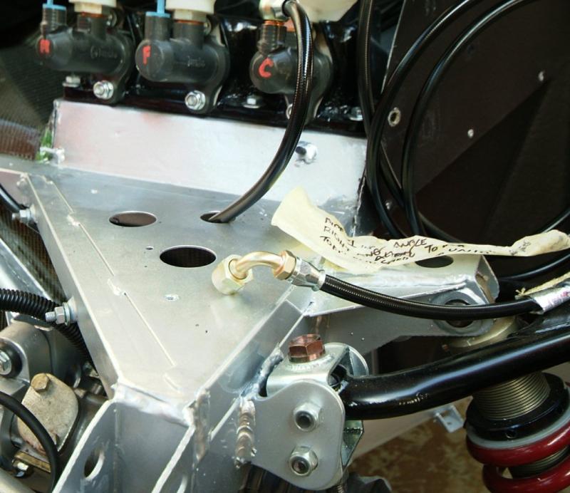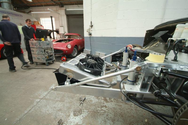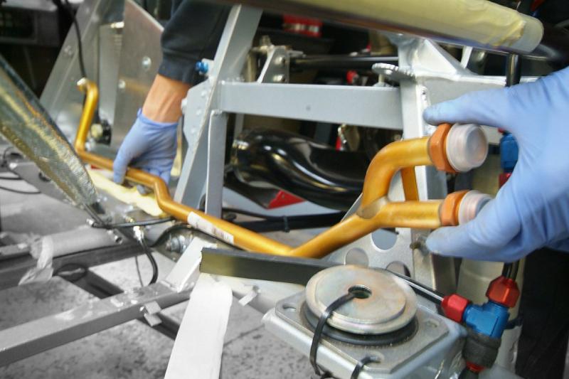 Now the plumbing starts. James starting work on the Air Jack system, radiator and brake lines. Second shot shows the line from the rad at the front to the coolant header tank. Once the plumbing is over the two major outstanding issues will be electrics and the engine where we are held up for a couple of parts.