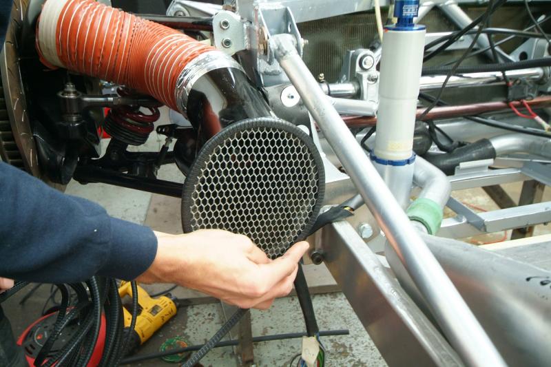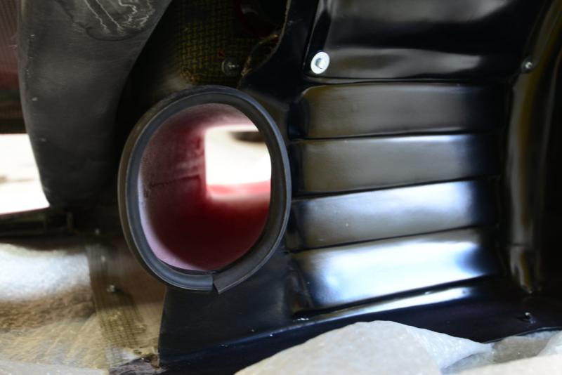 In this phase you can see James fitting up the Elephant trunk and trying his best on the bottom section but we are going to have to adapt. Also note the before and after finish on the duct itself. Certainly beginning to look the part. Front clam now mates perfectly with the brake cooling ducts and here you can also see the high pressure inlets either side of the rad driving that air into the low pressure area that is the front wheel arch.