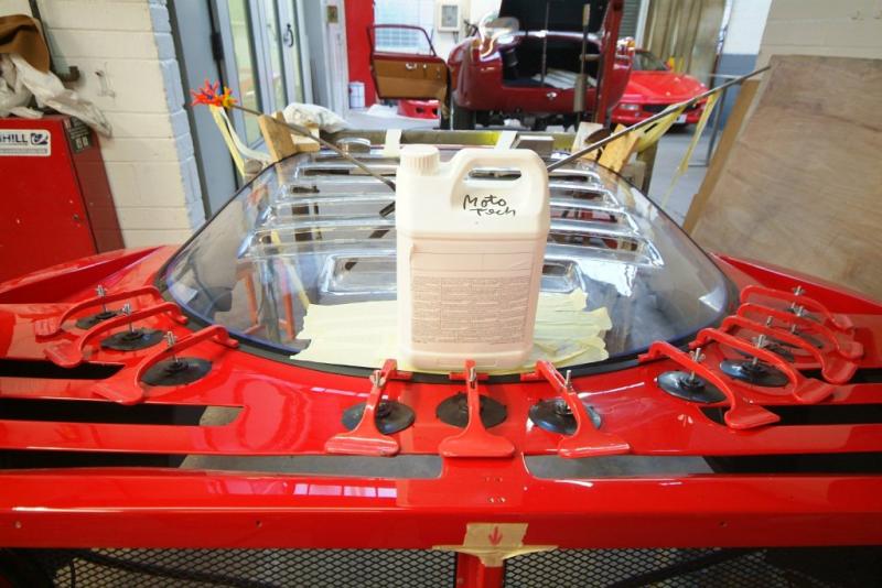 Rear screen all newly polished and finally bonded in place. I love the typical Mototechnique work arounds with rods, blocks and tape so as to ensure pressure is applied in every area.