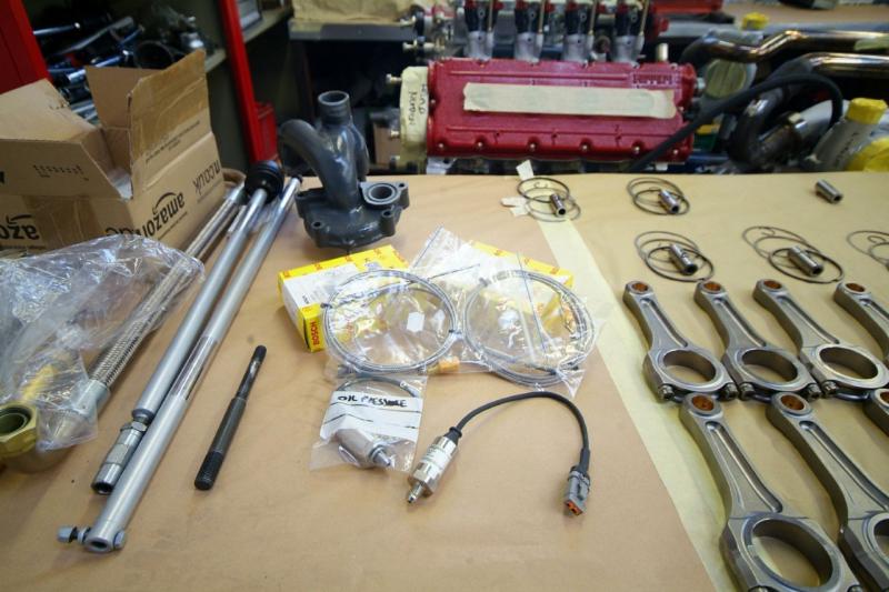 A few more engine detail shots.Pistons and rods in battle formation ready for installation and the assembly starts for real here. Heads are all ready to go as are injector rails etc, so we should have the pistons and rods in imminently and then the build up can continue. You can also see the details of the injectors, rails etc, all rebuilt, plated and better than new. Wastegates all soft mounted, cable and pipe routes and lengths resolved.