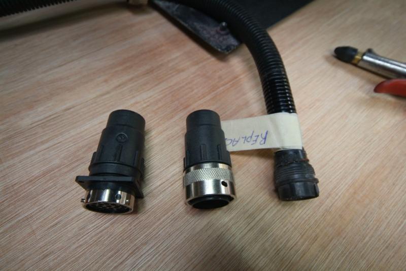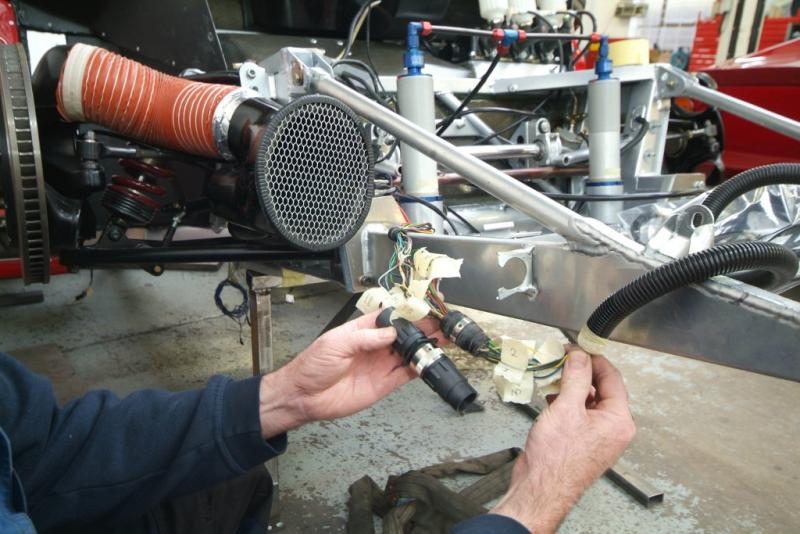 Mr Brown fitting the wiring loom to the front clam and replacing the “aircraft style “electrical connectors