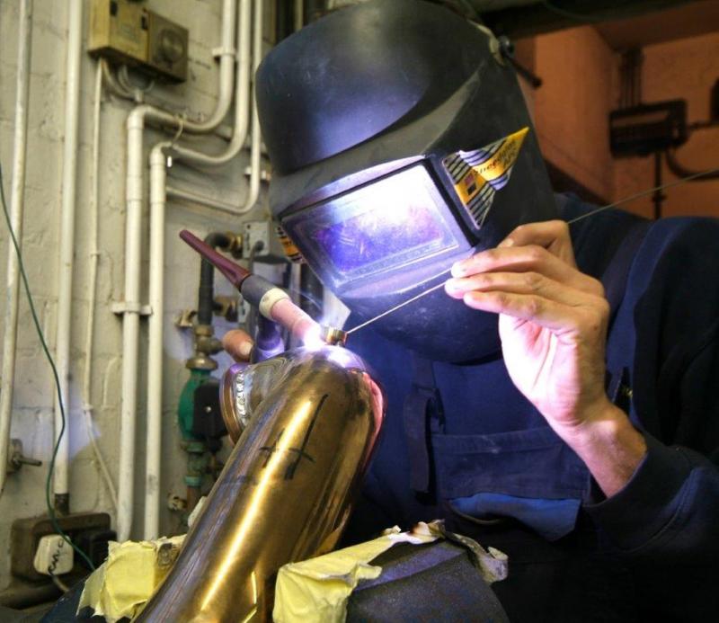 So, today’s helping is our restored cam drive sprockets in place on the end of the camshafts, oil feed pipes being trial fitted, water pump bearing being pressed into place on the hydraulic press, and Colin de-burring the new gear shim. Also a shot of some of the pipes we are replacing which look more like an Apprentices welding test!