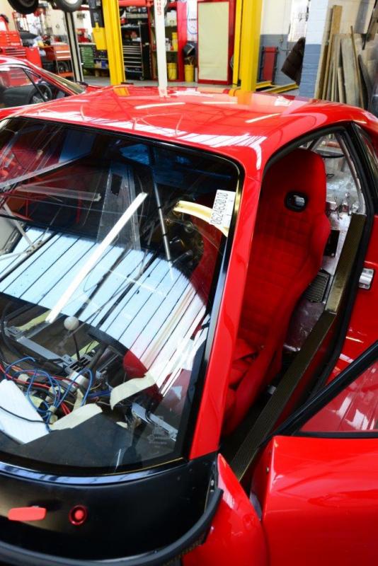 New windscreen with heating element now bonded in and seat temporarily fitted to check out positioning for mapping controls etc. Note the Michelotto LM seats which will either be cleaned or recovered in due course.