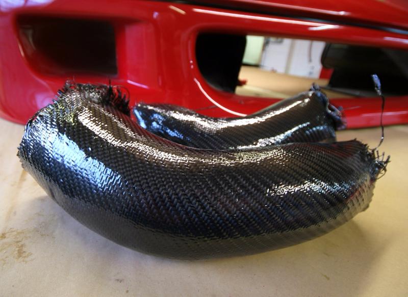 One further part needing modification and renewal, the inlets from the air boxes to the turbos. Here you can see some elephant hose being sacrificed. Filled with foam, stripped off and the foam core then used as a former for laying up the carbon.