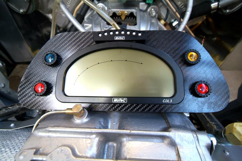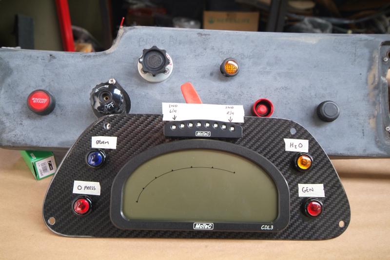 Dash now complete. Not happy with the lights, so those will change for something neater when we can locate, but meanwhile it now enables us to get the Motec loom sorted. We will also try and lose the Motec nomenclature to tidy it up.