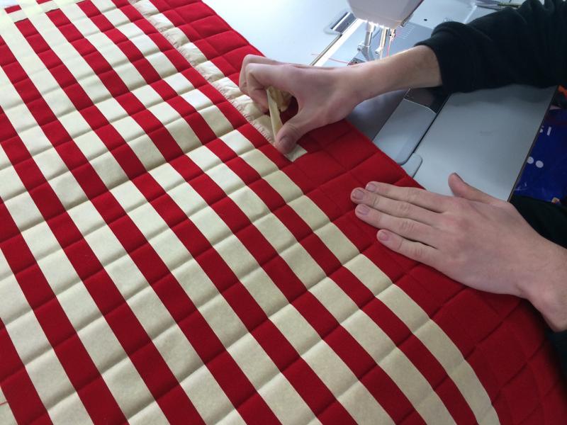 A little more on the trim front.As you will have noted the Michelotto chairs have a square stitching and I was interested to find out how Rorky duplicates this exactly. Masking tape as the guide is the answer rather than pencil lines which can leave a trace.Last pic is the old worn, stained and faded covers against the new quilted panels.
