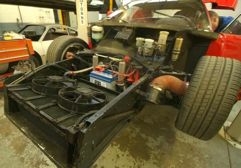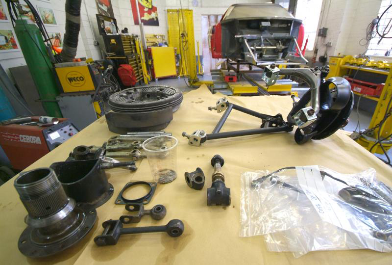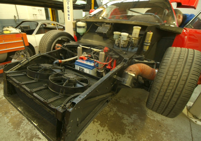 The strengthened wishbones which now are to be replaced with all new Michelotto ones, the modified front assembly still with its vestiges of road car use, the oil rad which had been bizarrely resited to the front, all headed for the bin!
