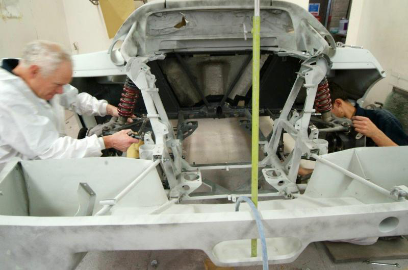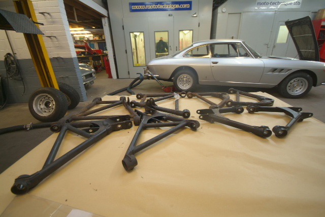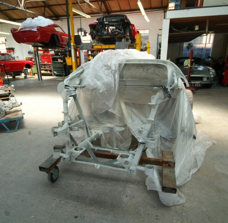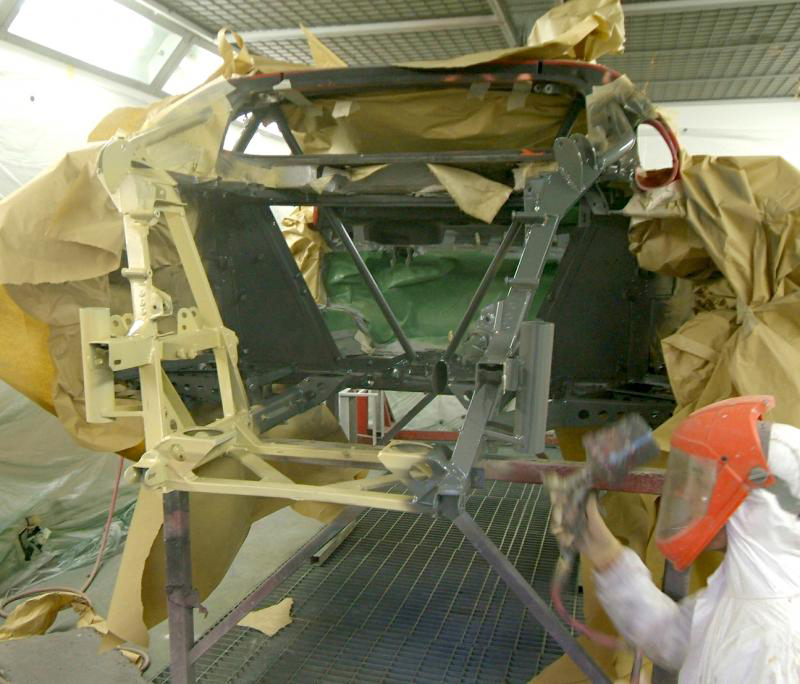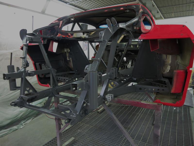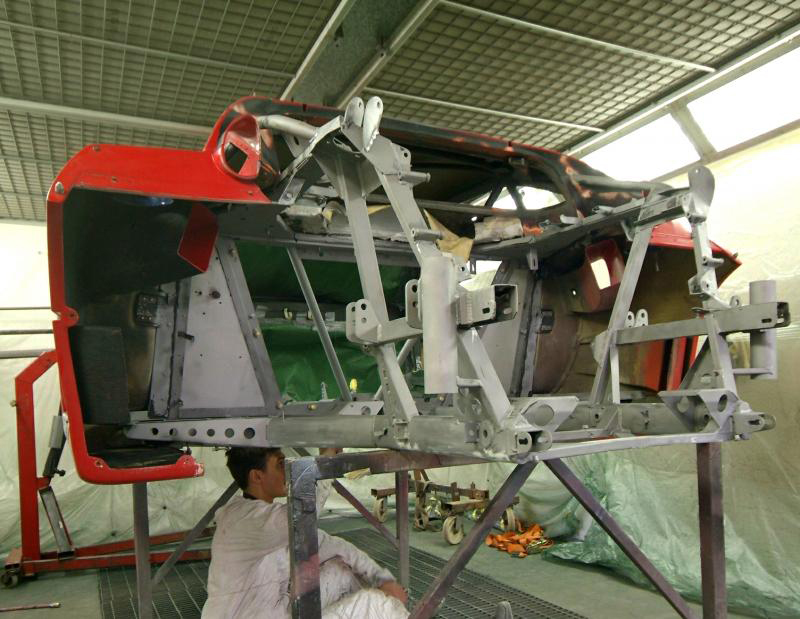 Just looking through the photos from last week and one recent one shows the chassis now with a mist coat so as to reveal any minor aesthetic imperfections in the frame which can then be dealt with. You can also now clearly see the refitted rear air jack mounts.Note in the background that she is in good company in the workshop, in one instance quite humbling.