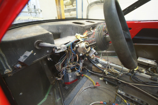 A couple more shots of the interior as it all comes apart. The wiring was a mess, added to and cut out with no logic-German engineering? Hardly. Note the large red fog light in the first image hanging down to the left of the wheel. Believe it or not that was an oil pressure light. Clearly the driver was going to have a hard time explaining if he had grenaded the engine due to low oil pressure. Simple, ugly, effective but now history. Remains of the Fire extinguisher system on the floor which will also be replaced. Given what we found and to be revealed in a future post, it could well have come in handy. Had it been charged.