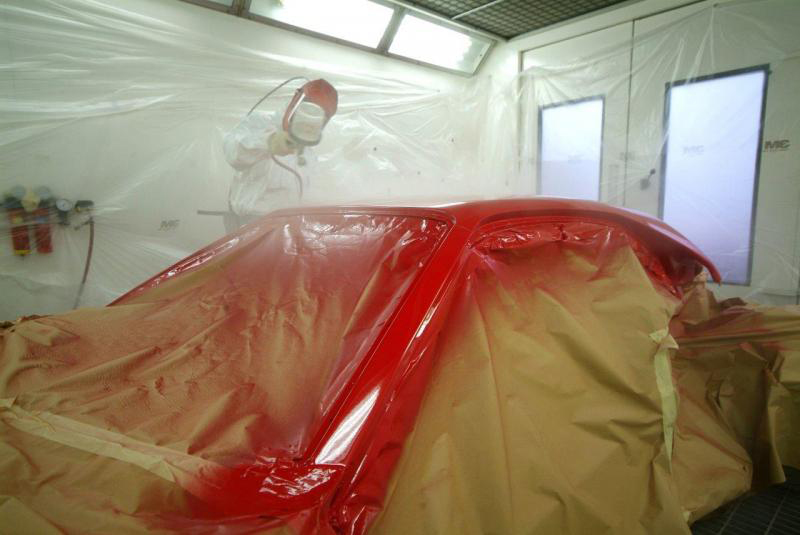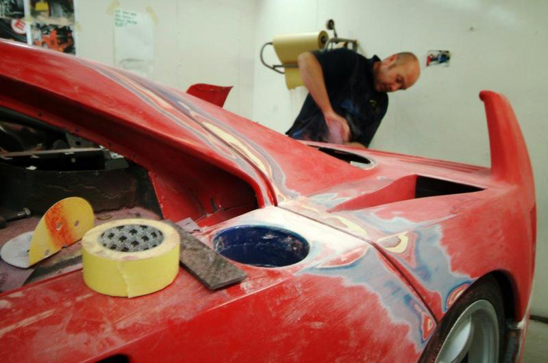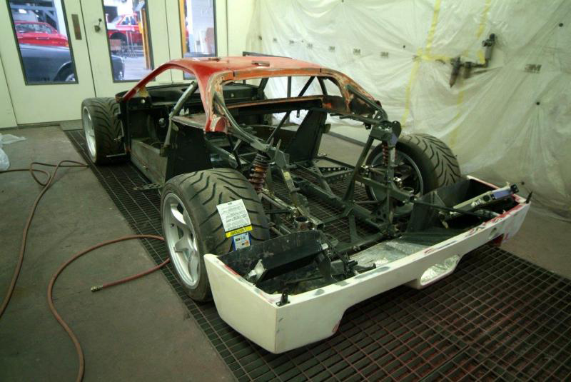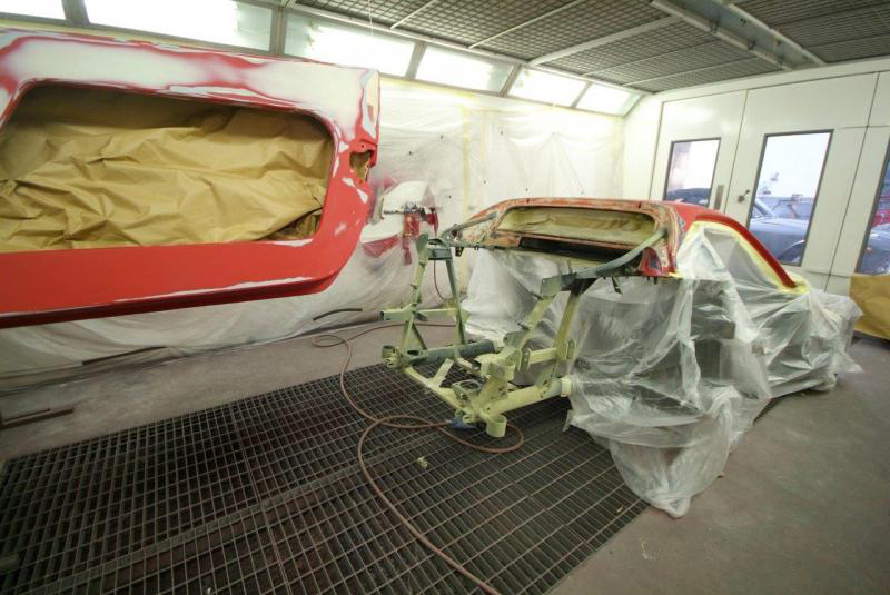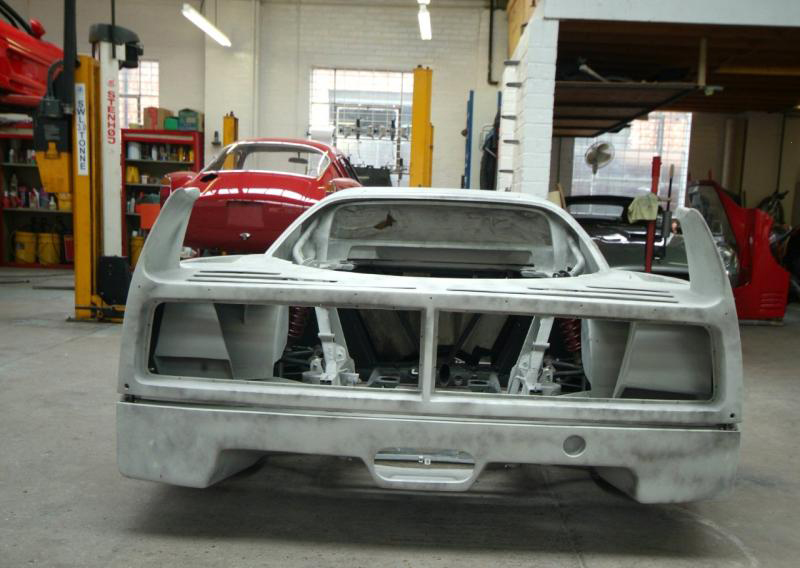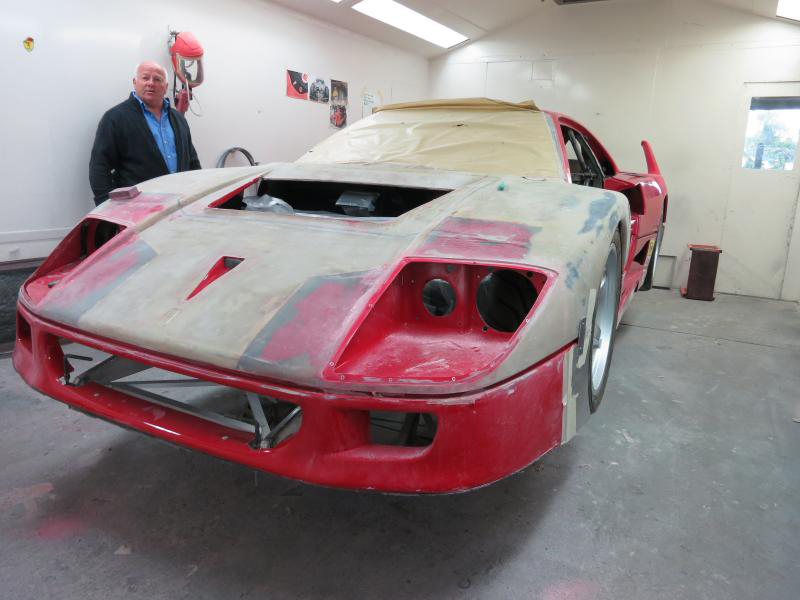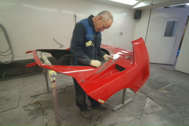 Finally a glimpse of colour over the lip of the moneypit!F40’s apparently were painted in slightly different shades of Rosso Corsa during their production cycle ranging from a darker red to one with a slightly more orange tint. We have gone for the slightly darker shade and apparently I now have to choose whether we go for an old fashioned ” Coach builders” full flat and polish finish which removes all ” Flow ” (Orange peel is a chunky effect whereas ” Flow is a smoother gun finish) or we lightly sand to leave a more natural finish – Any thoughts?Next up, before the week end, is for the chassis to go silver and that means real progress.