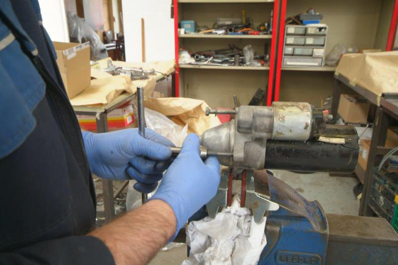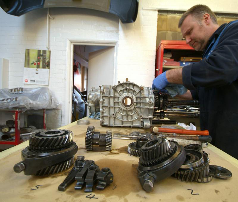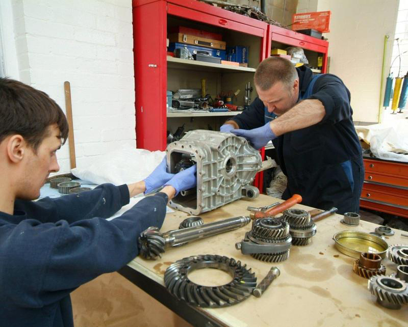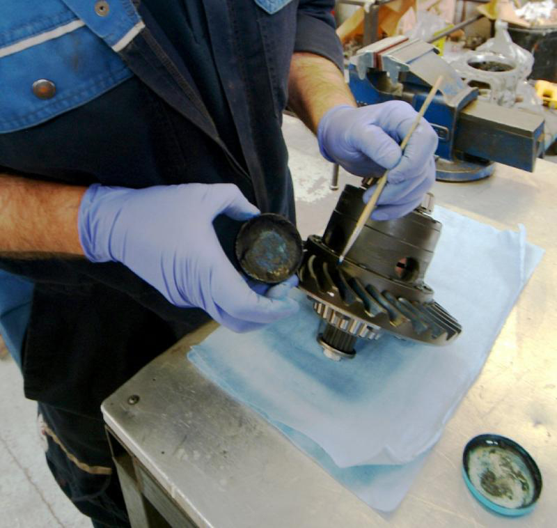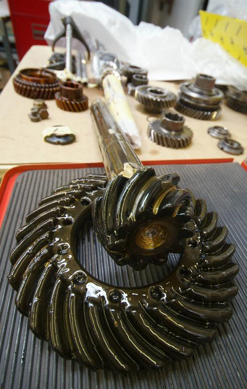 Whilst we labour for the next few weeks to get the bodywork perfect, progress is actually being made elsewhere mechanically. Engine is now in all its component parts and we have been working on the gearbox which is now ready for its new gears and awaiting the Crosthwaite and Gardiner reverse which they are apparently making to a higher quality than Factory as you would expect from such a firm. New crown wheel and pinion with shorter gearing installed as well as new differential and bearings and once we have reverse, the gearbox will be finished up.In these images you can see the backlash being set up with a dial gauge and also the crown wheel and pinion being painted with engineer’s blue to check mesh engagement. Last shots, all finished up and ready for the gears.Once finally assembled all casings will be resprayed.