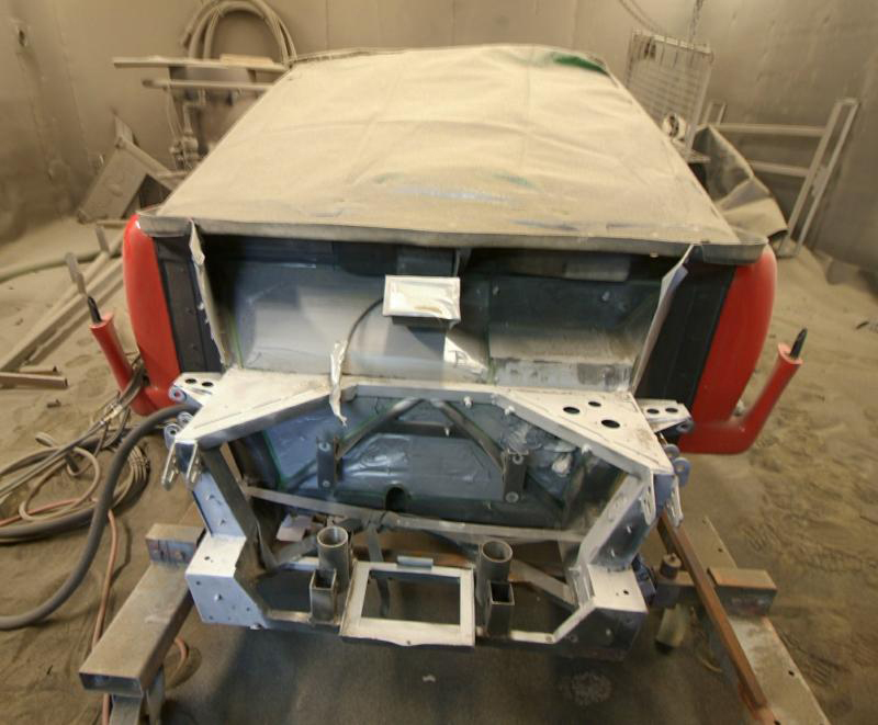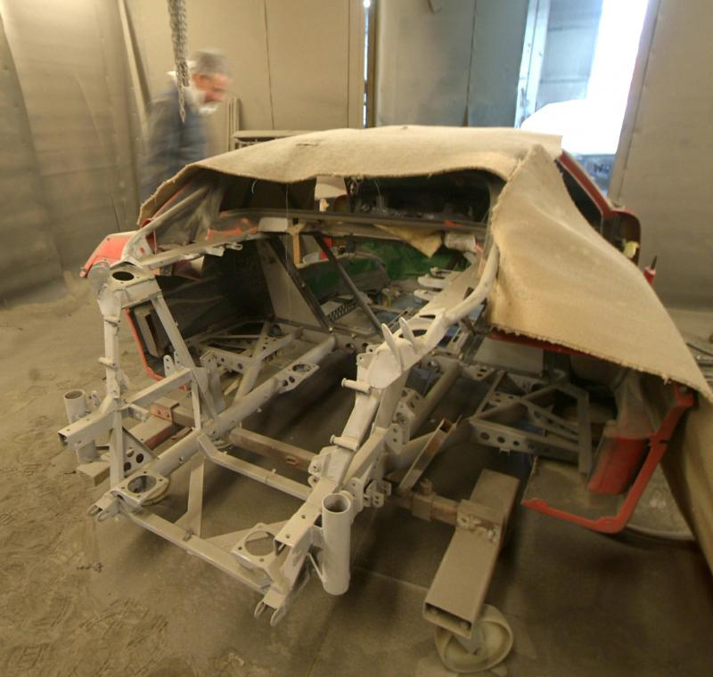 Well, this really is as low as you can go. From where we were to where we are and given where we are my time frame has gone out of the window as like all restoration jobs, this one has ballooned! Bear in mind this car recently went to the Le Mans Classic twice, driven in both directions and apparently never missed a beat.In conditions reminiscent of a Victorian workhouse the chassis is now being blasted back to bare metal and from there the build up can hopefully start in earnest. Interesting to see the central battery position. Suspension parts still being fabricated in Italy by Michelotto but we hope to have them within a week or so but he missed my birthday. Biggest issues remain on what we are to do with the engine etc but more on that to follow.