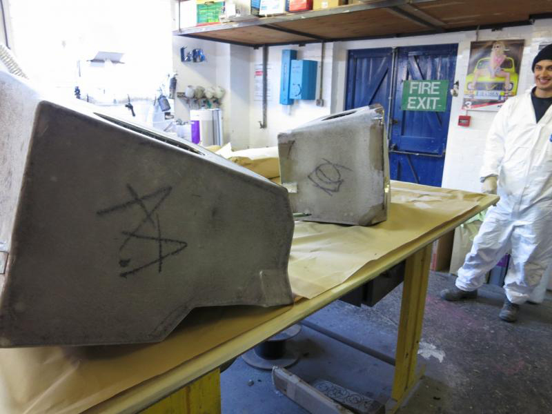 Starter motor has been sent away for matching to the new flywheel, which is currently in manufacture and due in a week or so, and will be overhauled at the same time.Final prep work underway to the underneath of the sills and these will be in primer early next week.Just another arty shot of the front clam lay up on-going. A lot of detailed and intensive work here.
