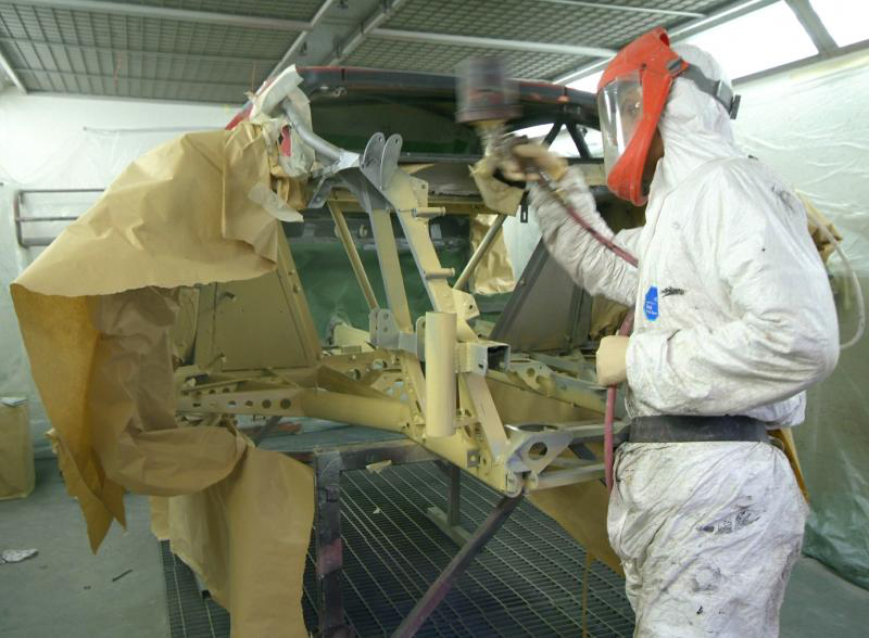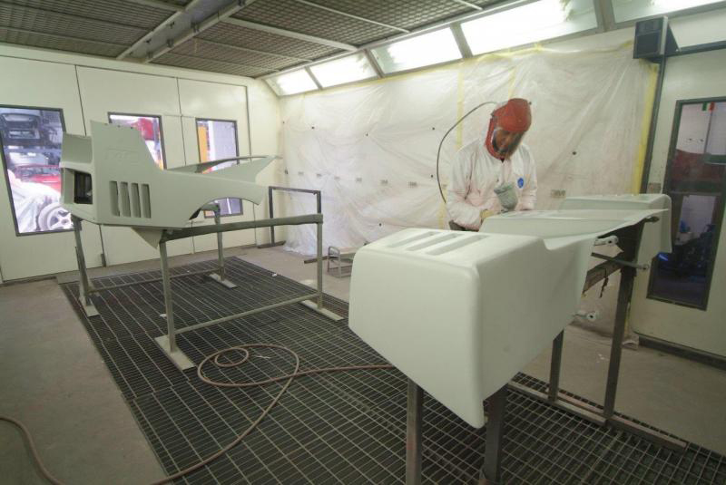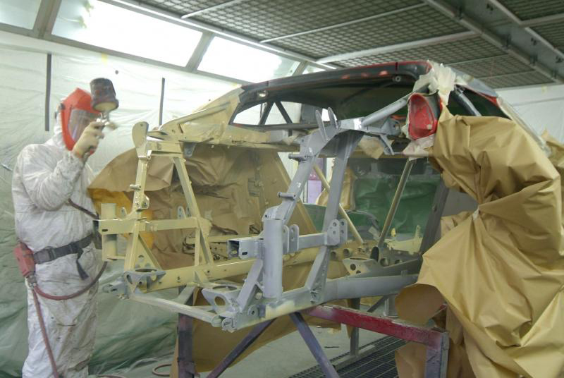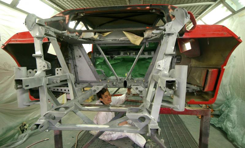 Well finally, hopefully, the last shots you will see of the old.We are now taking up all Mototechnique’s spraying facilities. Chassis stripped of all roll cage and stregthening in one paint bay for final prep and paint next week, and all body panels in other paint bay for final prep and primer this week.Then we can start to put Humpty back together again.And yes, for those really paying attention, I know about the front tyres!